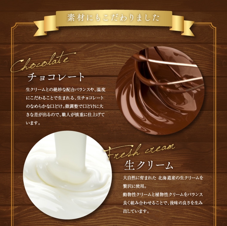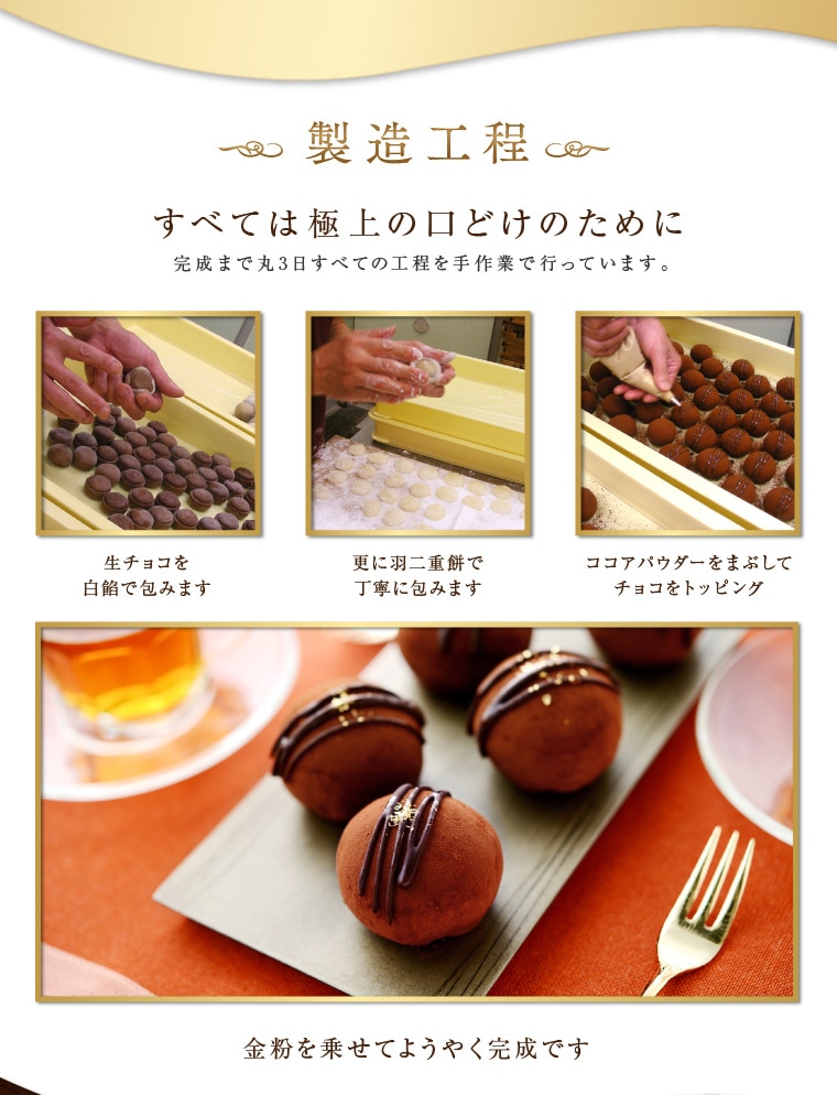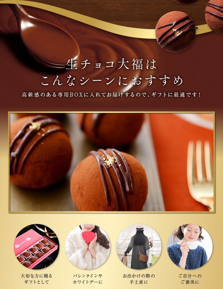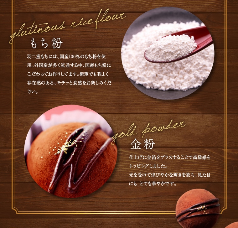 大口注文・法人のお問い合わせはこちら洋菓子店のパティシエも知りたがる口どけと後口の良さが特徴です。口に入れると体温でとける生チョコレートにこだわるため全行程を手作業で行っています。 口どけの良い生チョコレートを製造するためチョコレートとクリームの配合バランスやチョコレートをとかす温度など秘密作業を凝縮した一品です。 生チョコレートの口解けを邪魔しないように極薄の羽二重餅で包んでいます。 口どけの良い生チョコレートを邪魔しないよう羽二重餅も薄くしています。尚かつモチっと! チョコのトッピングで更に金粉で高級感を演出!