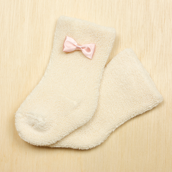 かわいいリボンのついた靴下は、オーガニックを使用して作られ、パイル生地で仕上げられています。 奈良県でこだわって作られた、今では数少ない日本産の靴下です。 ワンポイントのリボンが、アクセントとなり、赤ちゃんの上品なかわいさを引き立ててくれます。 パイル生地は赤ちゃんにとっても着心地のよく、不快感を感じることなく使用することができます。 また、パイル生地はしっかりとした生地なので、お出かけの際に靴がわりにご使用いただけます。