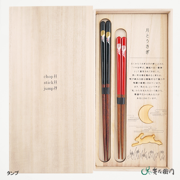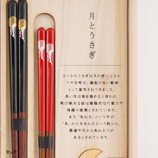 「前脚が短く、後ろ足が長く大きいうさぎは坂を登る事が早いので物事がトントン拍子に進む」 「うさぎの長い耳は福を集める」「多くの子を産む事から子宝に恵まれる」など、 古来よりその特徴からうさぎは幸せの象徴とされてきました。 そんなうさぎをモチーフにした箸と箸置きを特製の桐箱に収めました。