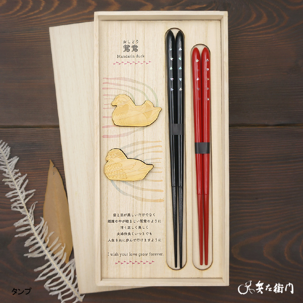 仲睦まじい鴛鴦(おしどり)をモチーフにした桐箱セットです。 中板はカラーなので華やかさがあります。ハートの貝殻を散りばめたお箸をセットにしました。