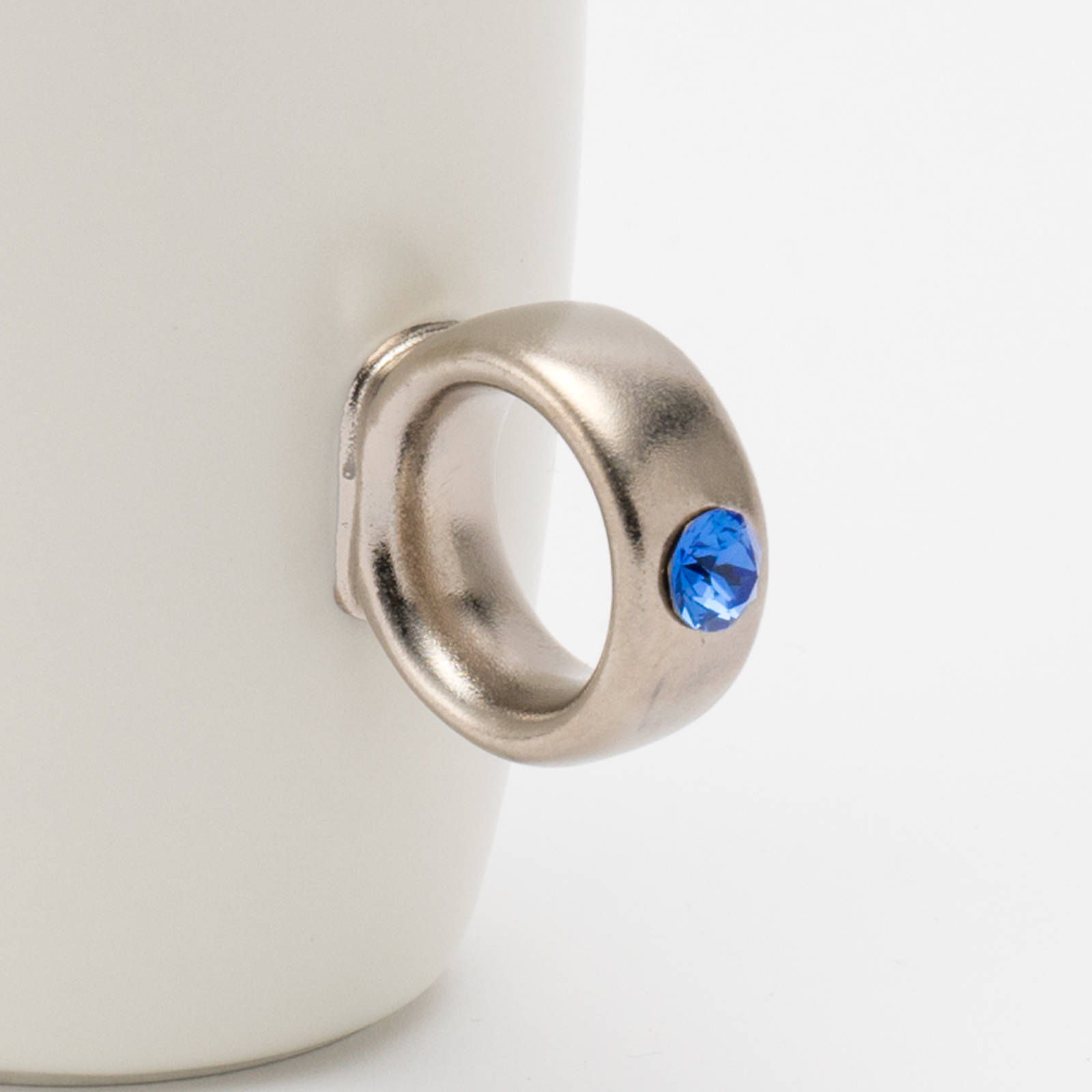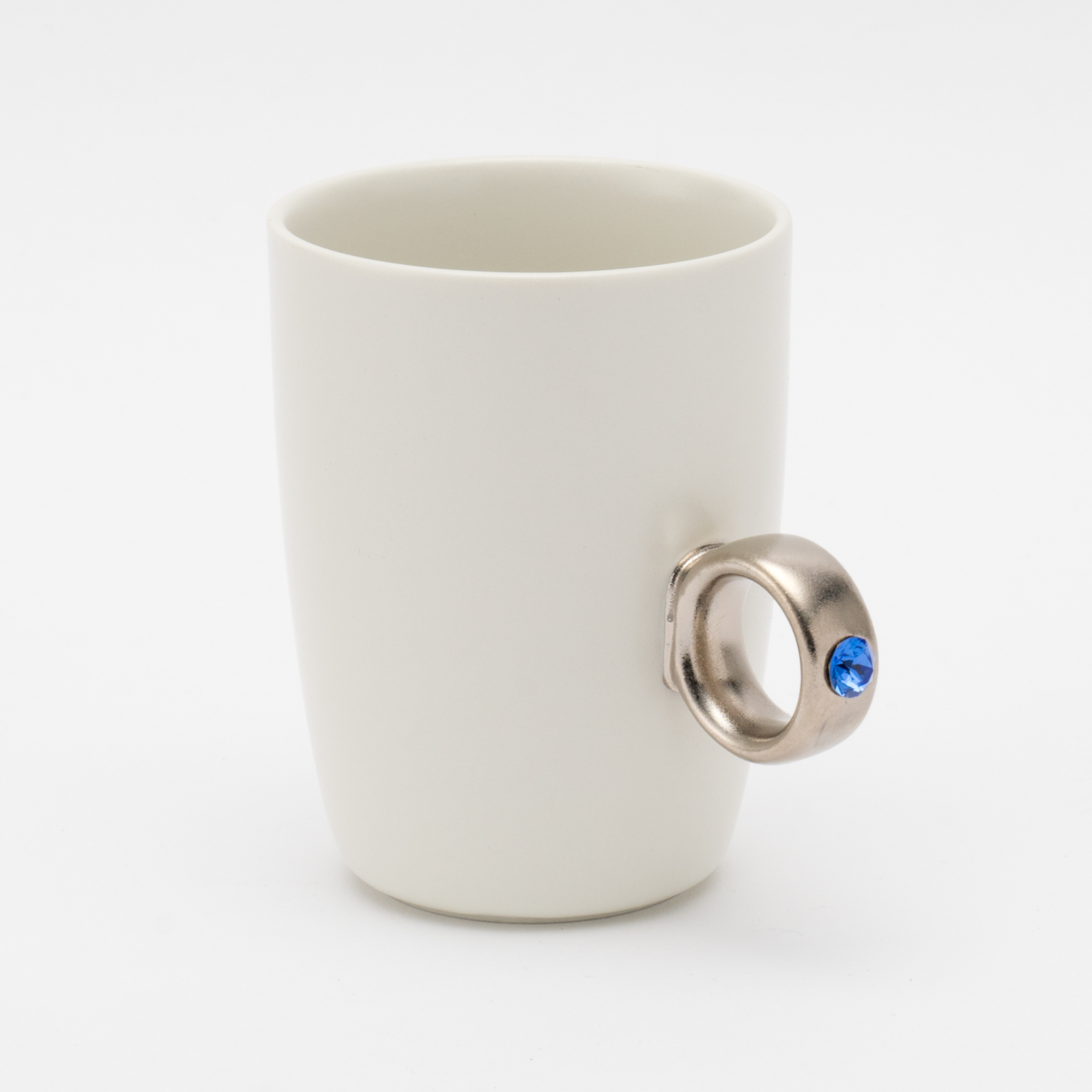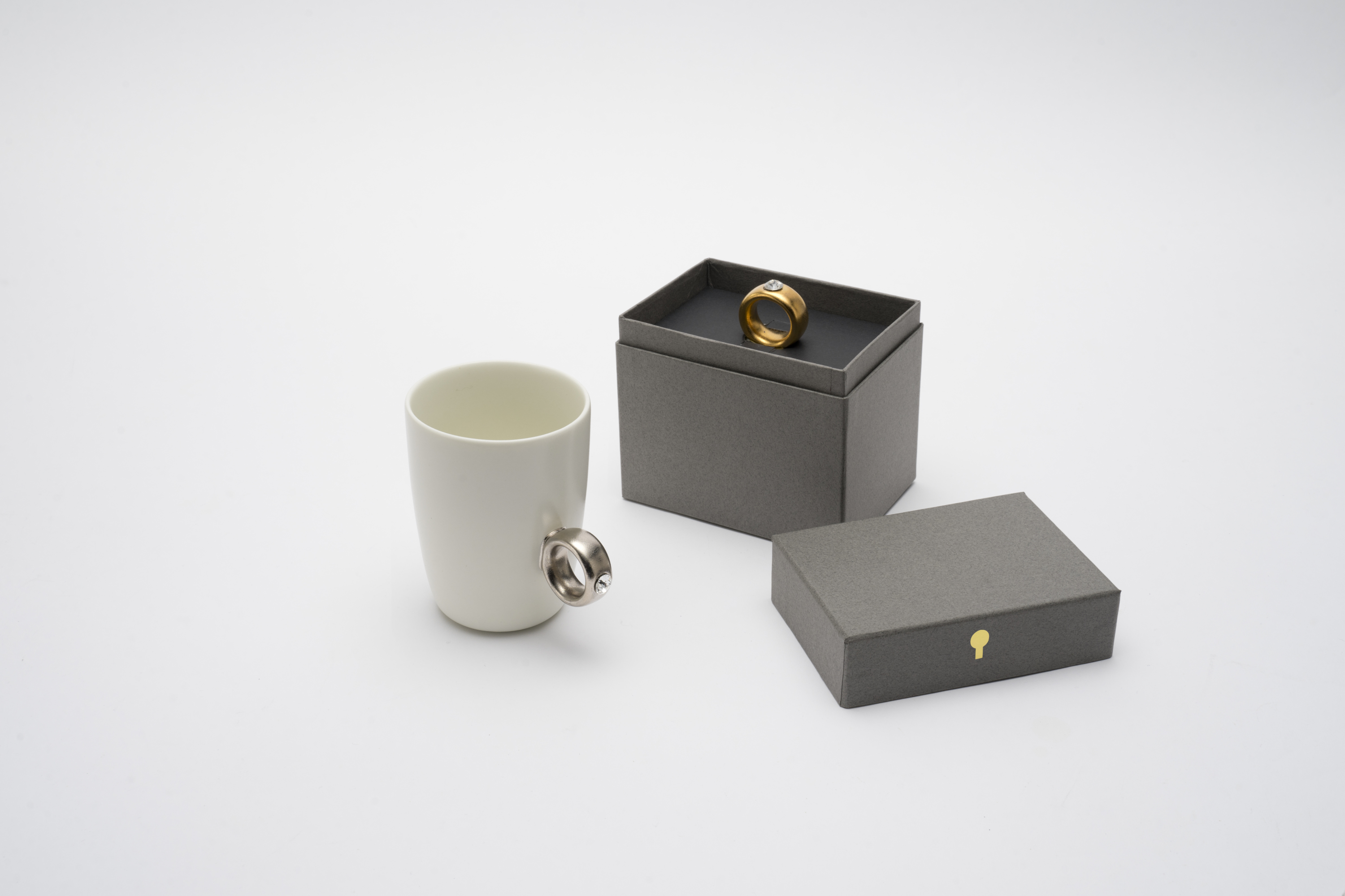 リング部分は純度の高い金と白金を使用しており、職人が筆で一つひとつ手塗りで仕上げています。また、V字に彫り込まれたリング部分に、8mmのクリスタルガラスを埋め込むことで、奥行きのある煌めきを演出しました。指輪をはめるように、カップの取手に薬指を入れカップを握ると、まるで本物の指輪をつけているかのようになるマグカップです。