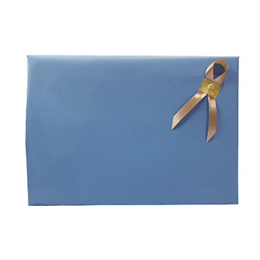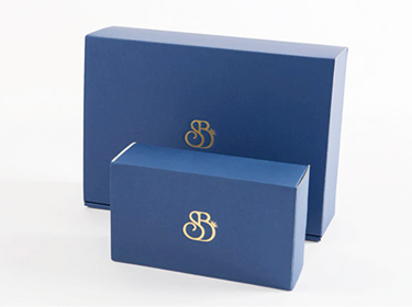 シンプルで上品なブルーのボックスに入れてお届けします。ゴールドカラーのブランドロゴがおしゃれですね。有料オプションで紙袋や包装を付けることができます。