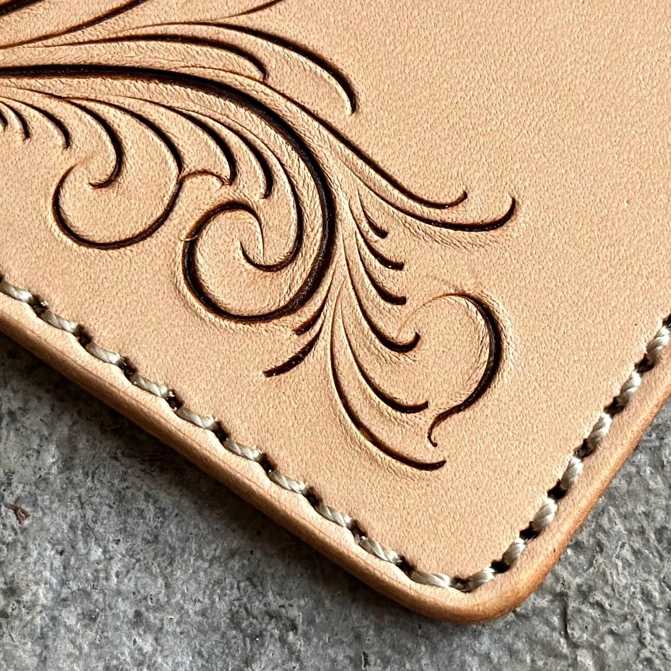 カービングとは何種類もの専用工具を使い、手彫りで柄を描きあげる卓越した職人技術の結晶です。 フリーハンドで描くため、1点1点微妙にデザインが異なるのもハンドメイドならではの魅力です。 きめが細かく、手染めやカービングに適したヨーロッパ産の高級皮革を使用しています。 使い込むほどに柔らかく馴染み、美しいエイジングをお楽しみ頂けます。