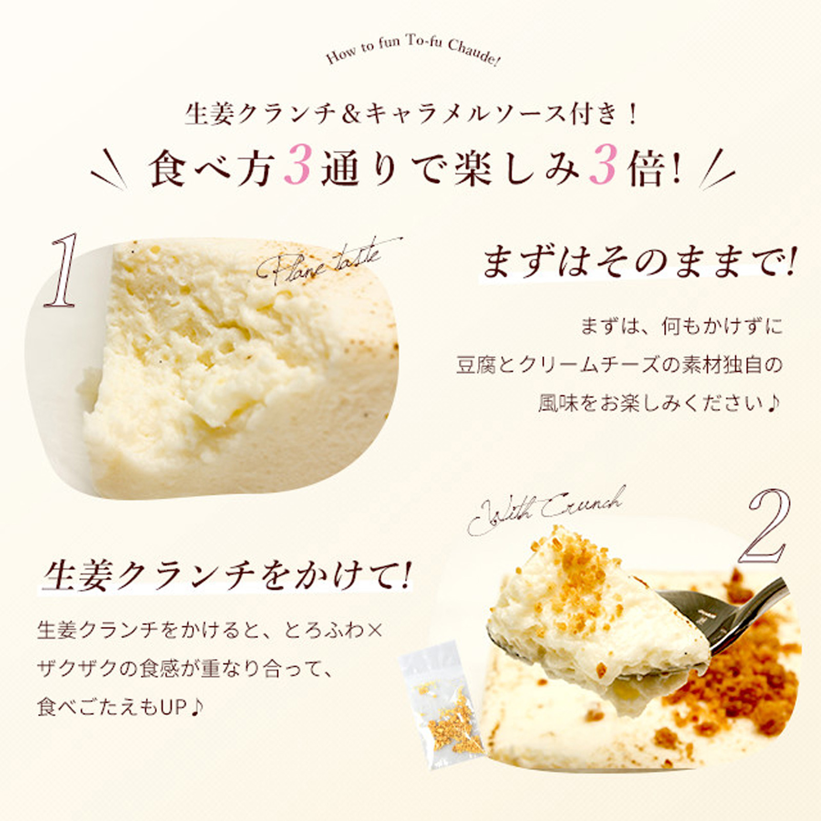 「とろふわトーフチャウデ」は、京都産の滑らかな豆腐と北海道産のクリームチーズを使用したレアチーズケーキです。豆腐を使ったヘルシーなレシピで、解凍するとふわふわとろとろ、半解凍でシャリっとした食感が楽しめます。