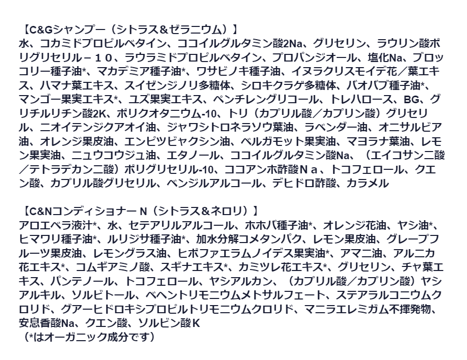 | 内容量/内容物 | C&Gシャンプー 236mL×1 C&Nコンディショナー N 236mL×1 |