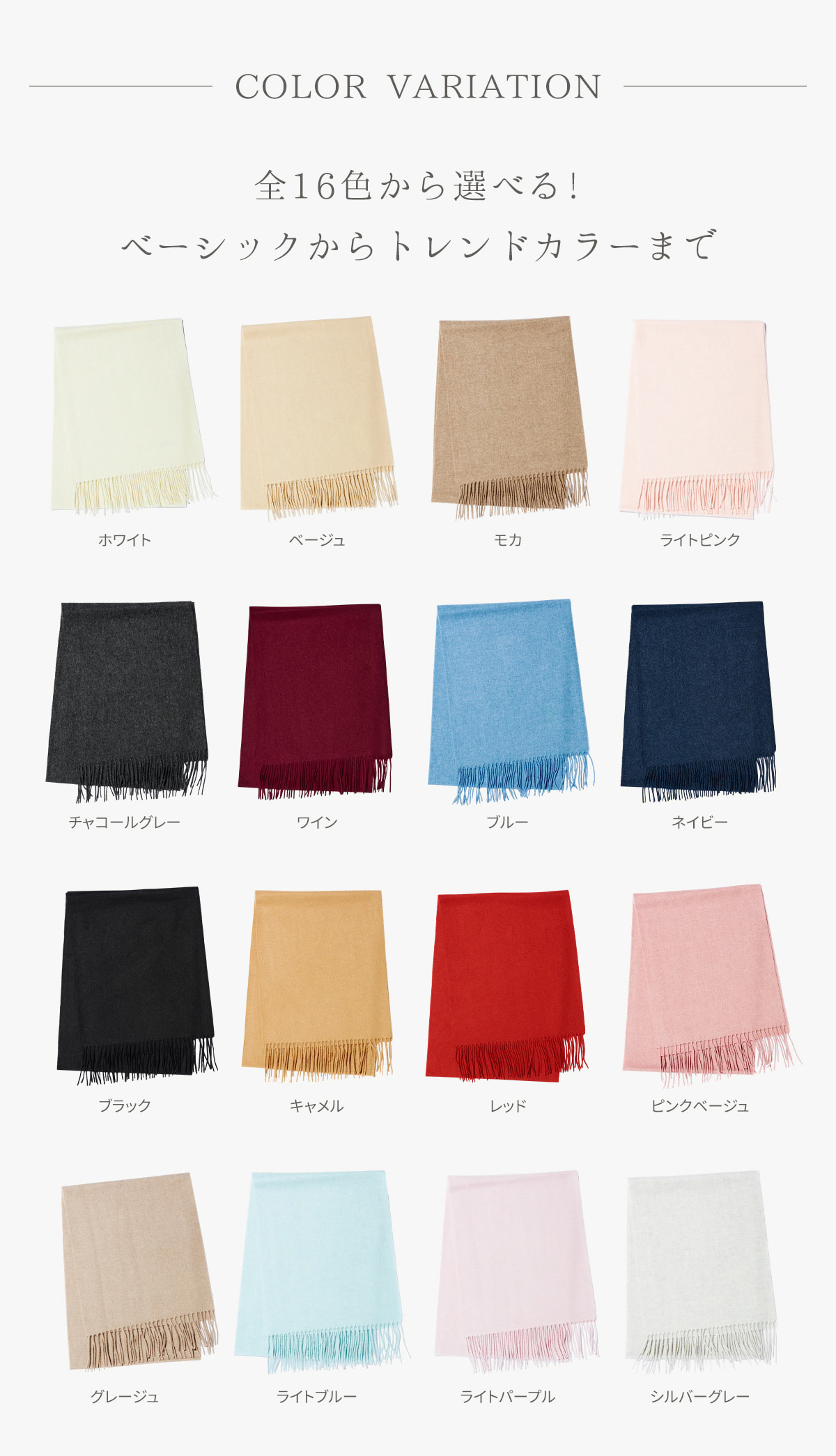 冬のギフトにぴったりなカシミヤ100%無地マフラーです。内モンゴル産のカシミヤを贅沢に使用しているためとても暖かく、なめらかな肌触りが魅力です。カラーバリエーションは16色と豊富にご用意しております。有料でお相手のお名前を刺繍することができます。eギフトで贈る場合のみ、受け取る方がお好きな色に変更できます。