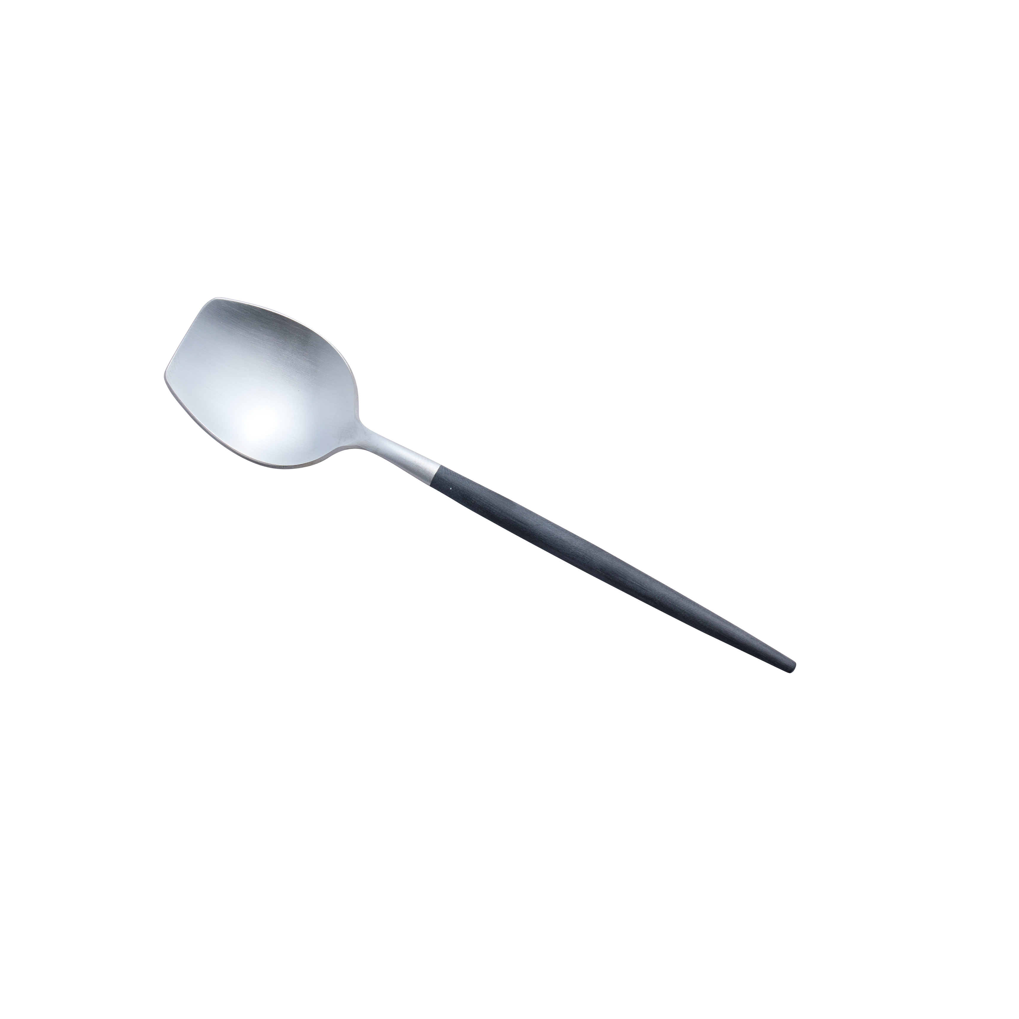 元々は従来品のシュガースプーン。 先端が平らなため、容器の底をすくいやすく、アイスクリームスプーンとしても人気の高い商品です。 丁度良いサイズでしたが、先端の角による口当たりが気になっていました。繊細な唇への違和感を軽減することと、シュガースプーンとしての機能を失わないことを両立させるべく、メーカーのデザイナーや職人の試行錯誤の末、完成したスプーンです。 近い将来、従来品のシュガースプーンはこの形状に変更になる予定です。