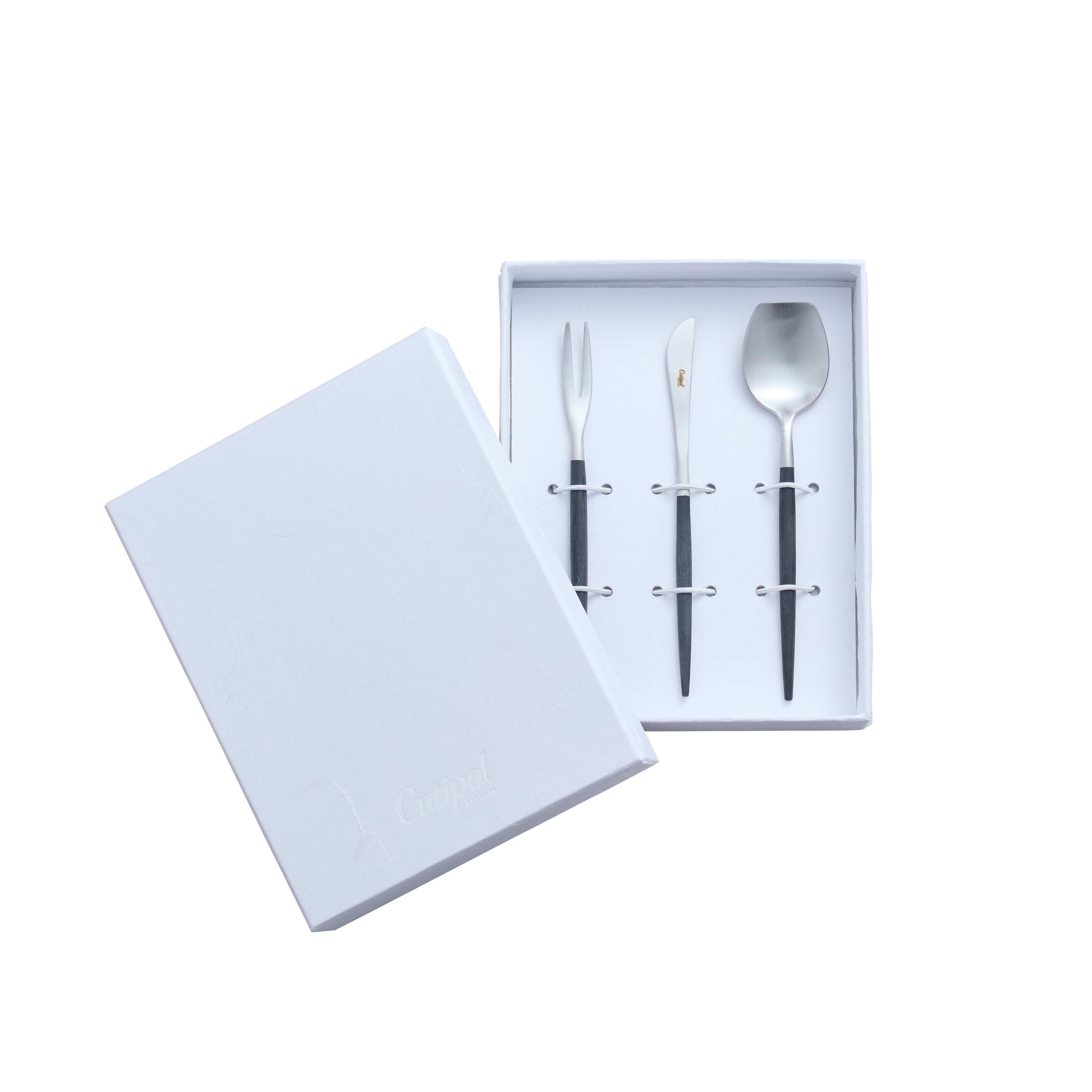 クチポールの代表的なシリーズ “GOA” のシャープなフォルムはそのままに、和菓子を美しいまま召し上がれるようにデザインされた「菓子切り」。 そこに「甘味匙」として、滑らかな口触りになるよう改良を加えたアイスクリームスプーン、 そして、クチポールの誇る人気商品の一つ「姫叉」(ジャパニーズフォーク)。