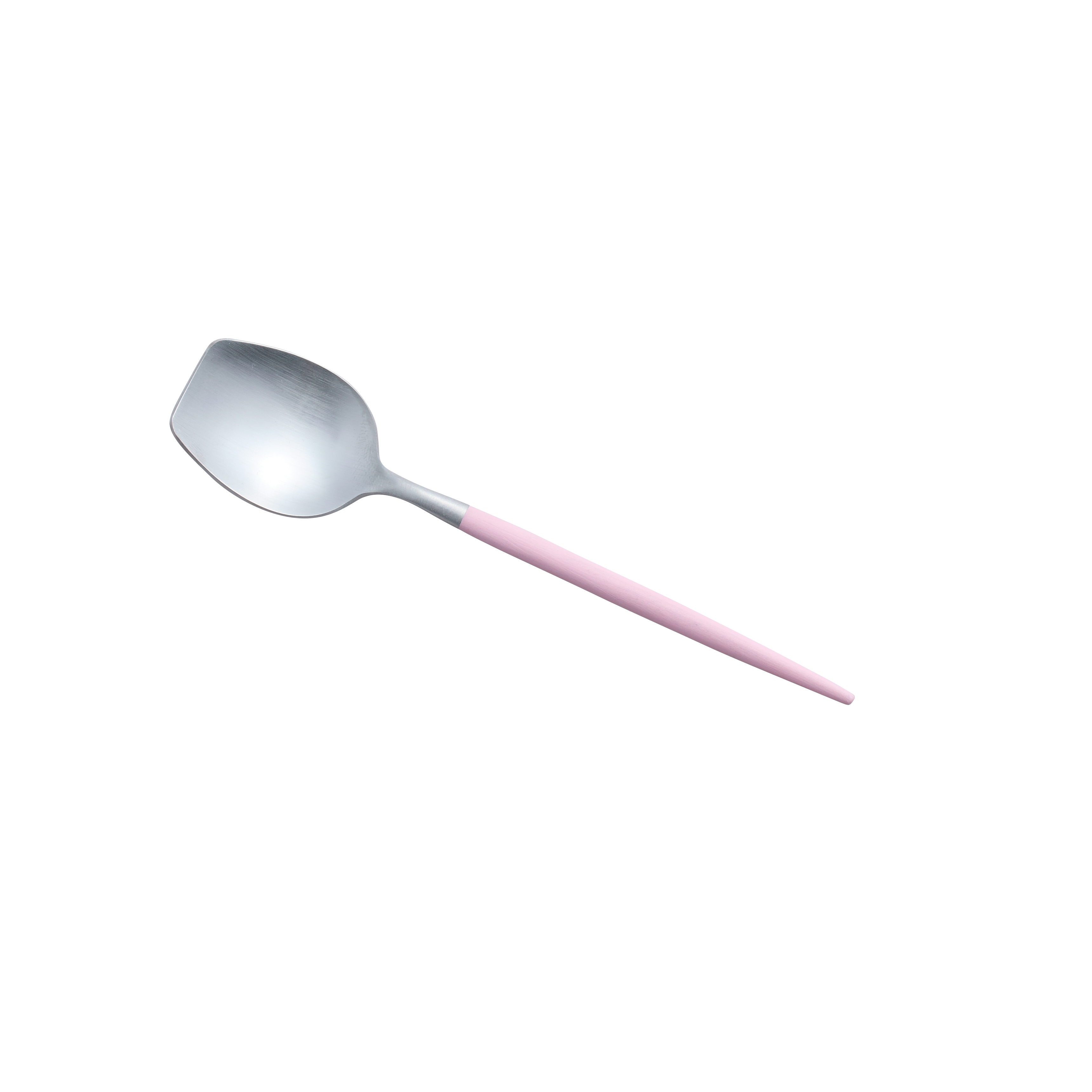 元々は従来品のシュガースプーン。 先端が平らなため、容器の底をすくいやすく、アイスクリームスプーンとしても人気の高い商品です。 丁度良いサイズでしたが、先端の角による口当たりが気になっていました。繊細な唇への違和感を軽減することと、シュガースプーンとしての機能を失わないことを両立させるべく、メーカーのデザイナーや職人の試行錯誤の末、完成したスプーンです。 近い将来、従来品のシュガースプーンはこの形状に変更になる予定です。