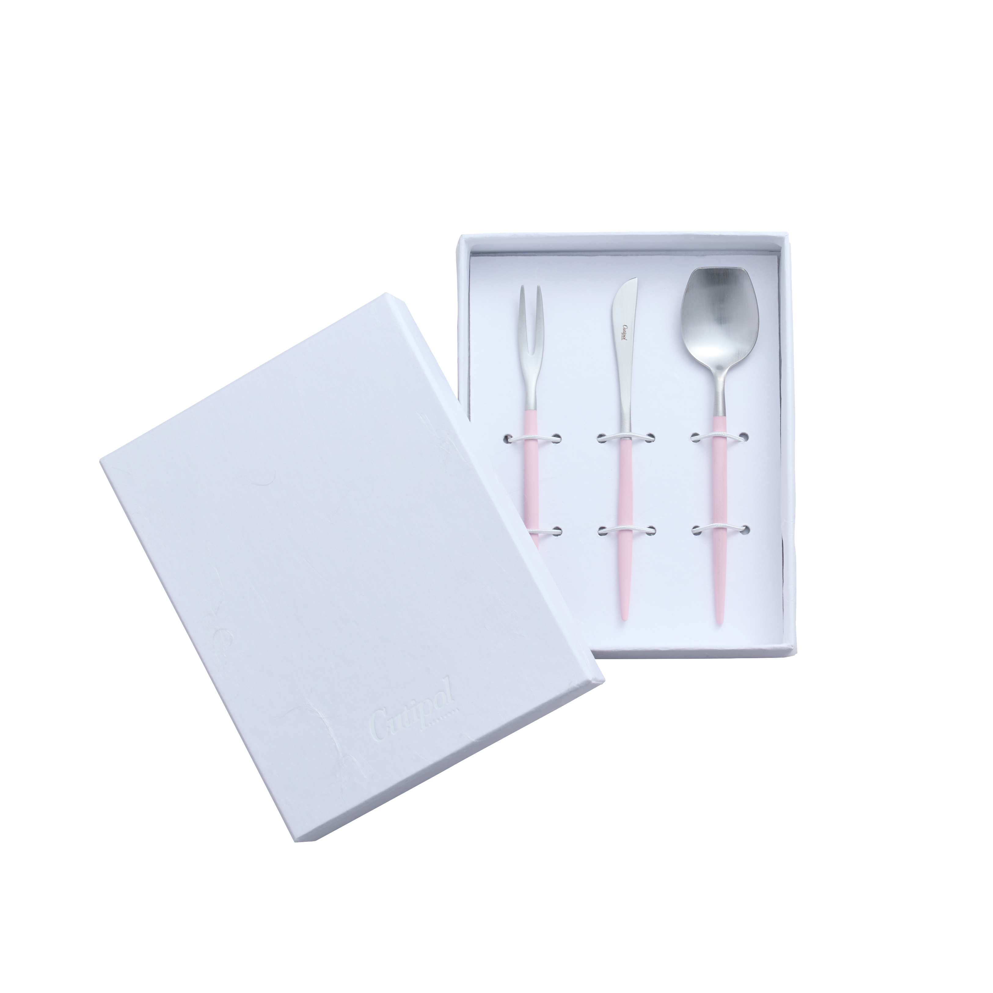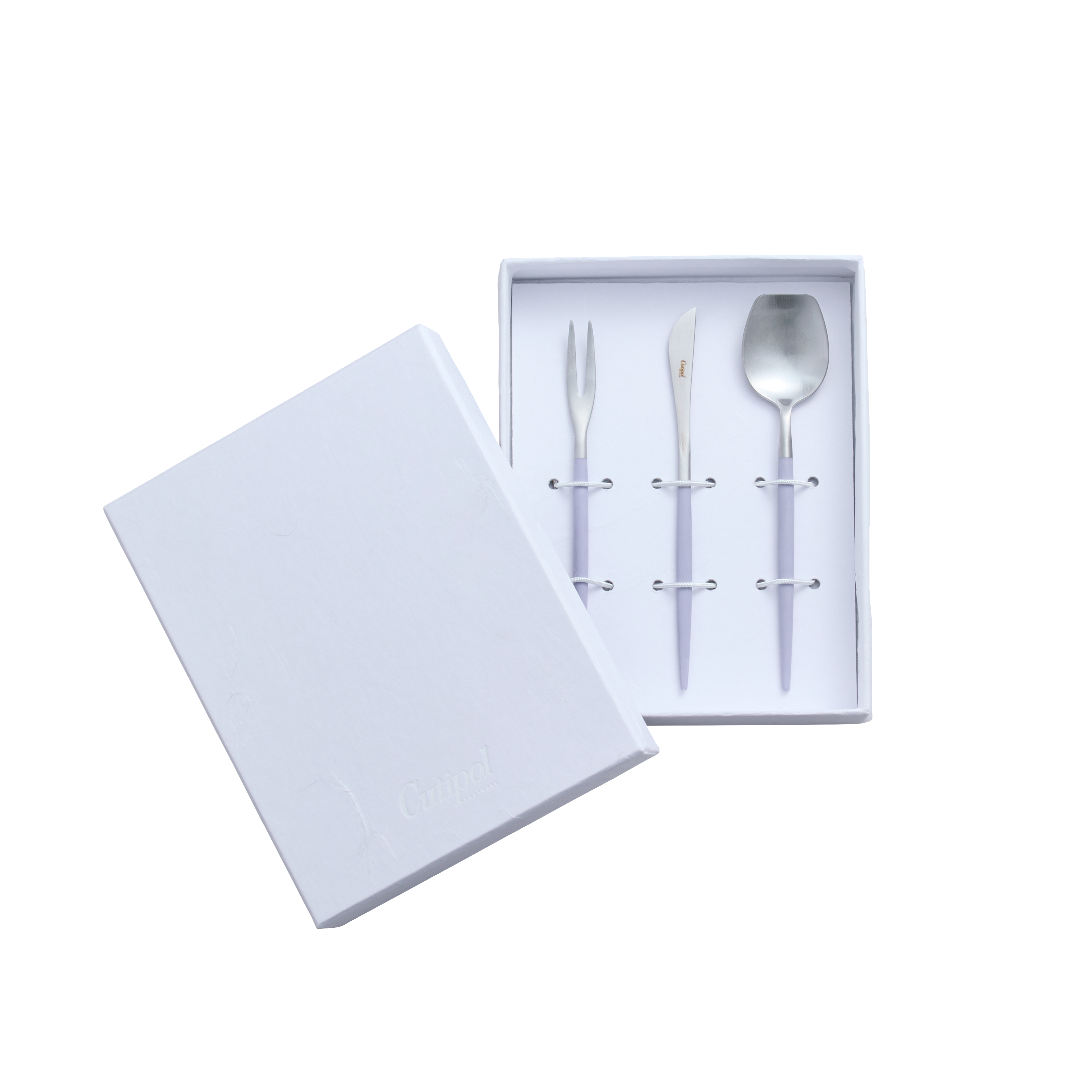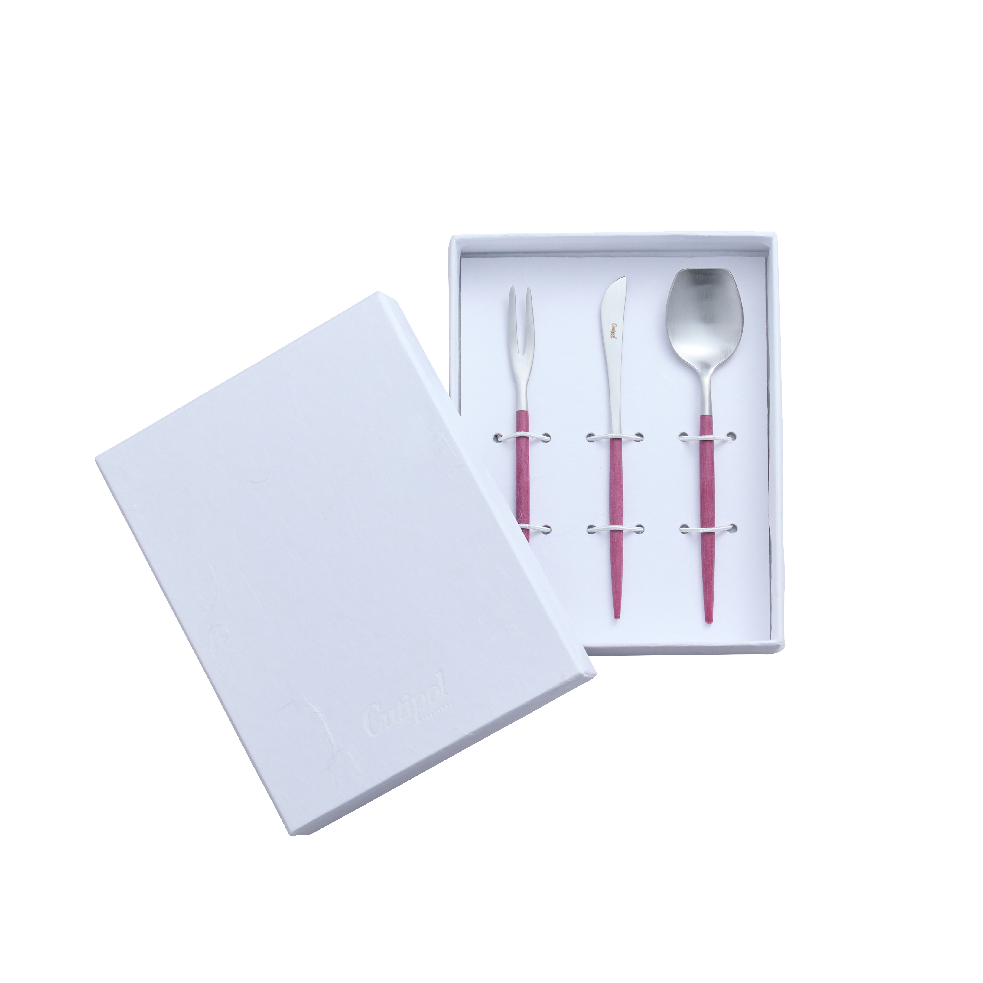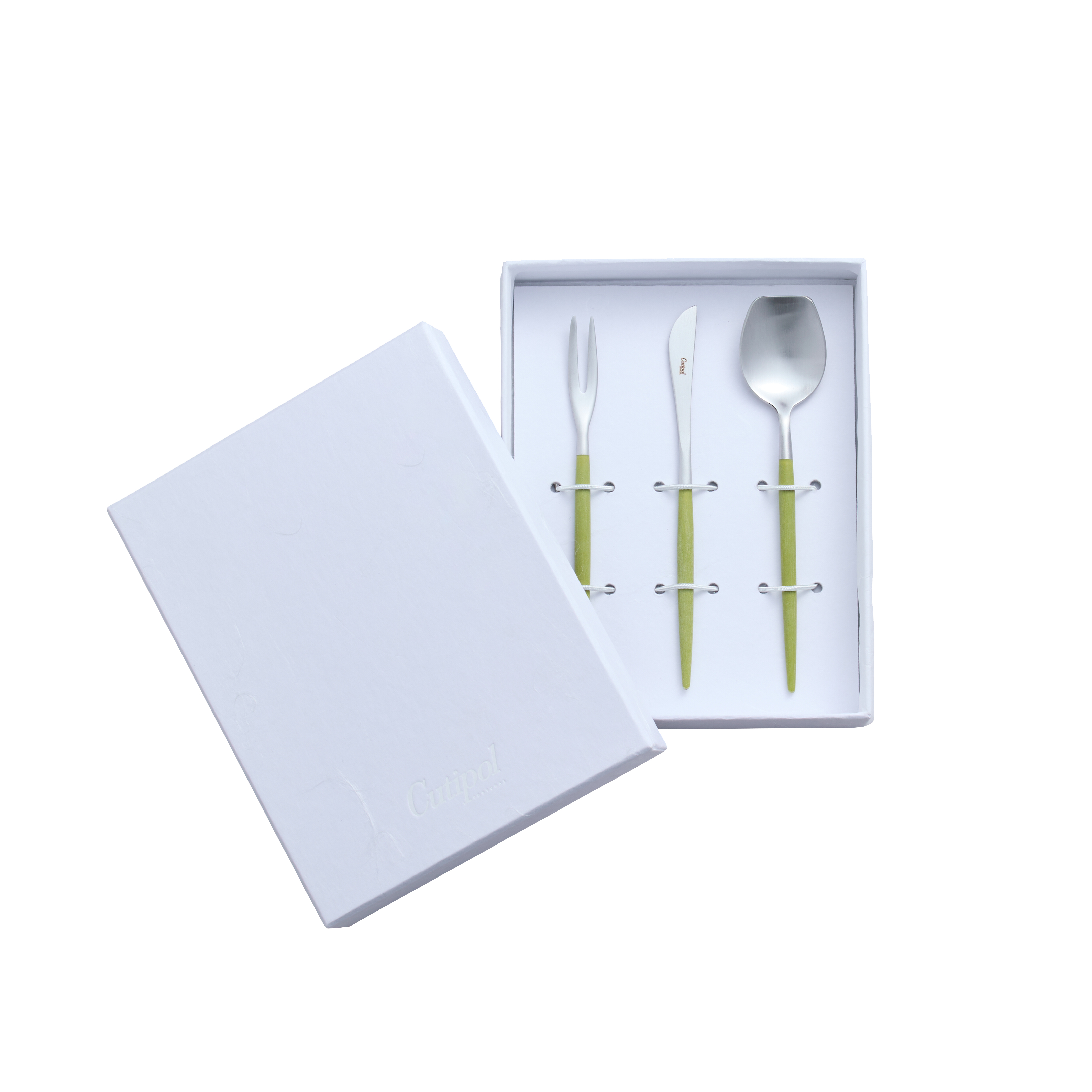 クチポールの代表的なシリーズ “GOA” のシャープなフォルムはそのままに、和菓子を美しいまま召し上がれるようにデザインされた「菓子切り」。 そこに「甘味匙」として、滑らかな口触りになるよう改良を加えたアイスクリームスプーン、 そして、クチポールの誇る人気商品の一つ「姫叉」(ジャパニーズフォーク)。 小豆色と抹茶色はこの和菓子スイーツカトラリー用の別注色です。
