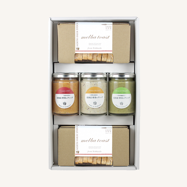大口注文・法人のお問い合わせはこちらノースファームストックがお届けする、北海道産小 麦・全粒粉を使用した香ばしいメルバトーストと、 北海道野菜をふんだんに使ったクリーミーな3種の ディップ。北海道野菜のディップは温めた野菜に付けたり、肉・魚などとも相性抜群なのでぜひ一緒にお楽しみください。