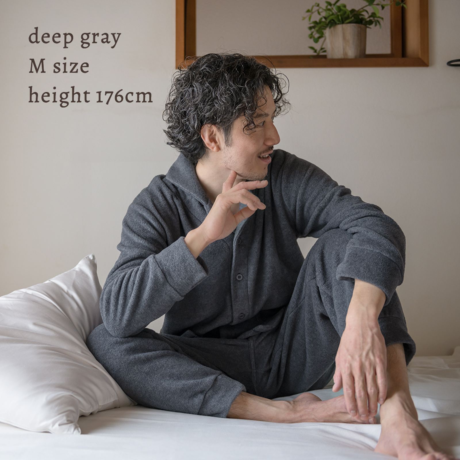 寒がり専用あったかパジャマの前開きタイプ。大人テイストのテーラード衿は、ボタンを留めれば首元がさらに暖かくなります。パンツは男性に嬉しい前開き付きで、絞り型の裾は冷気が入りにくく丈が長くても引きずりません。吸汗性があり静電気が起きにくいパジャマのためのフリースです。
