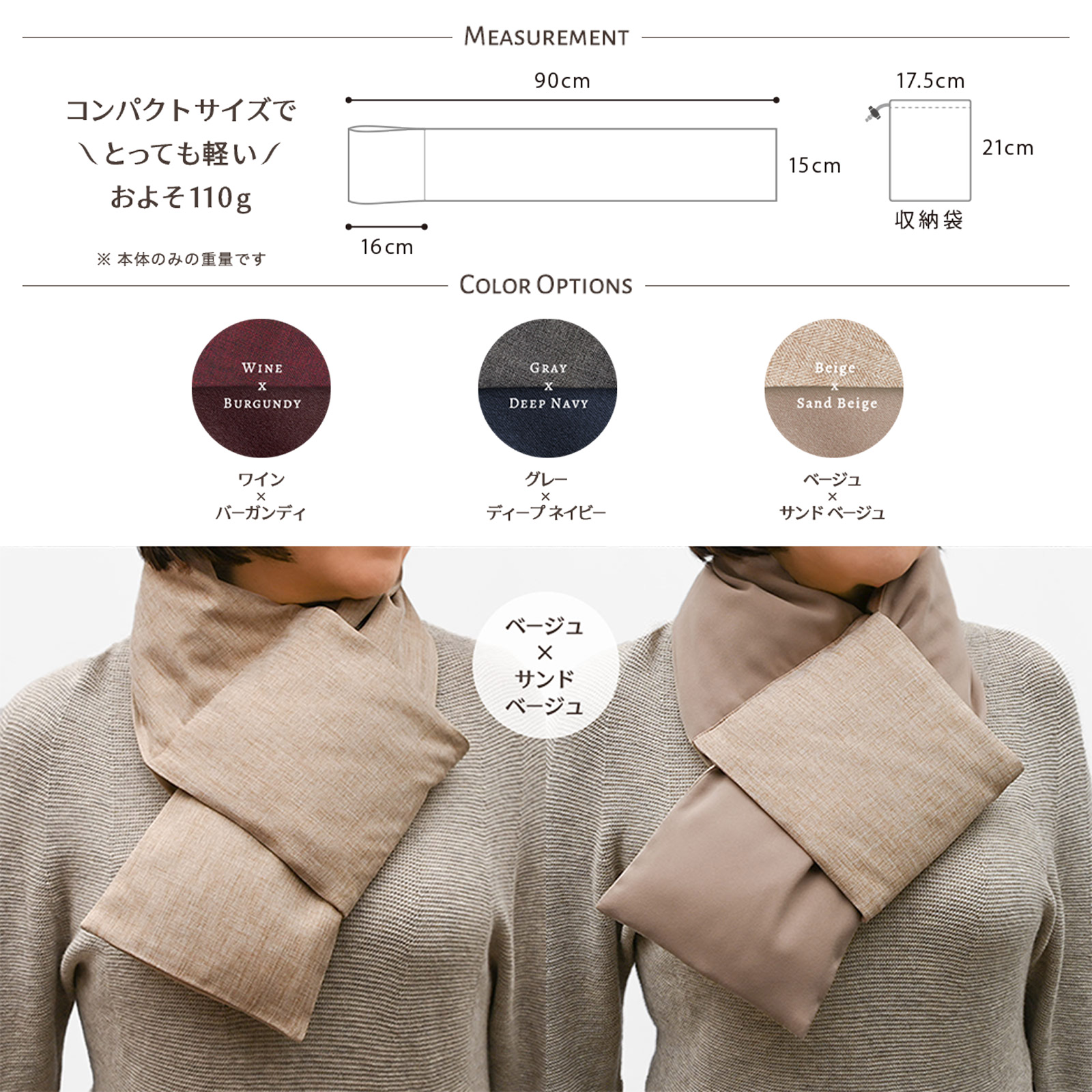 柔らかな側地はガサガサ音がせず、家で洗えるのが嬉しいポイント。保湿性抜群で高品質な欧州産ホワイトダックダウンを使用し、差し込み式で平らに収まるので外出時のコートの下でもすっきり着用いただけます。体温を味方にするエコな防寒グッズです。