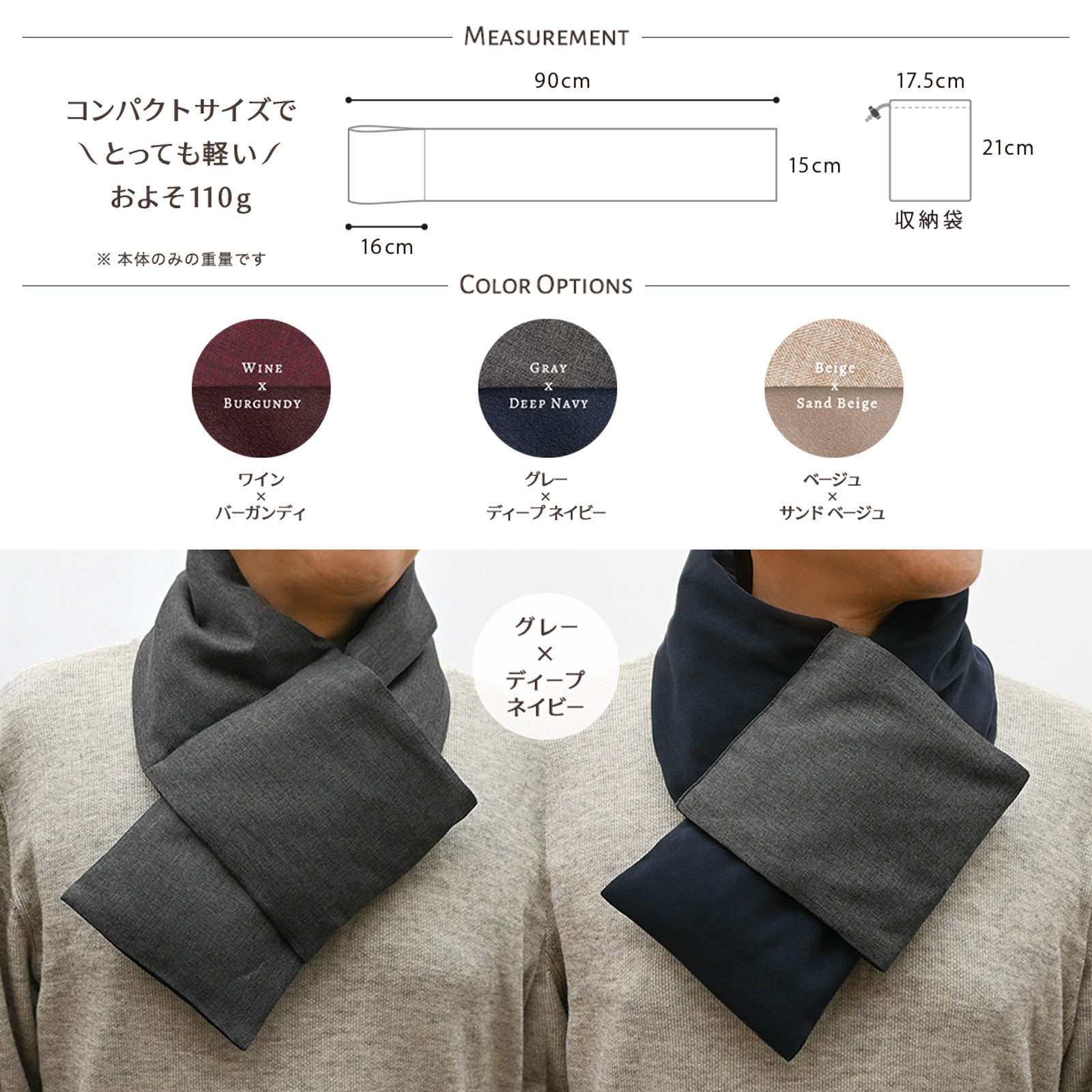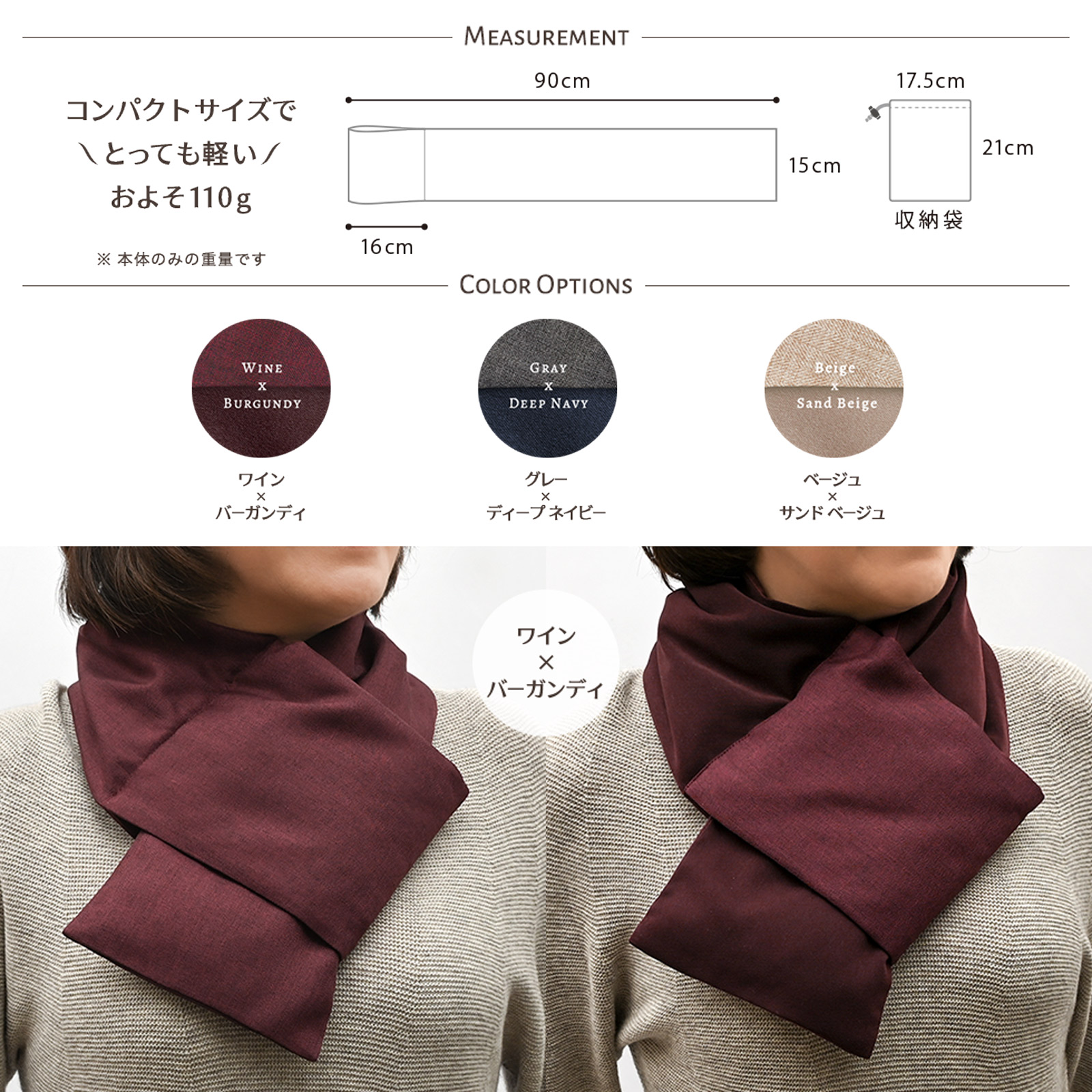 寝るときにも着けられるよう、かさばらないサイズ感と敏感な首まわりに優しい側地のネックウォーマーです。 外出時のコートの下でもすっきり着用いただけます。 体型や性別を選ばないのでプレゼントに迷うこともなく、ペアギフトにもおすすめです。