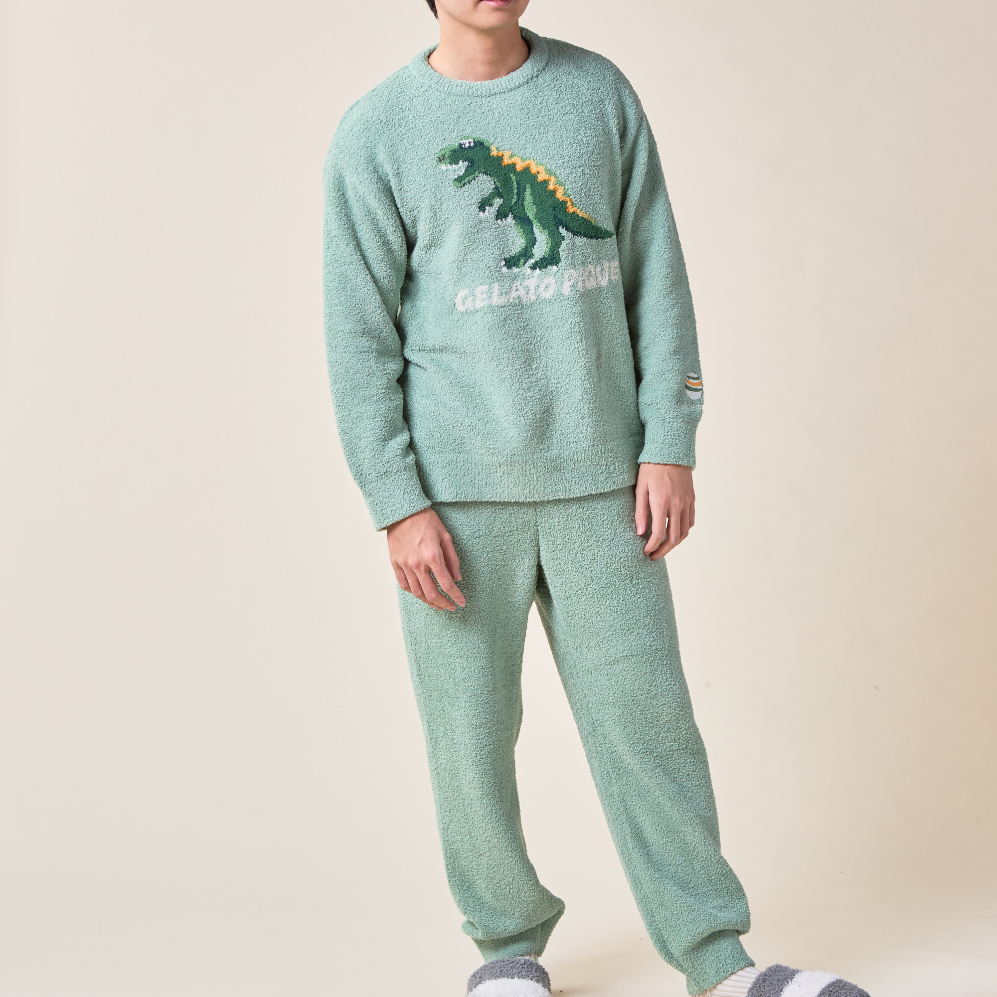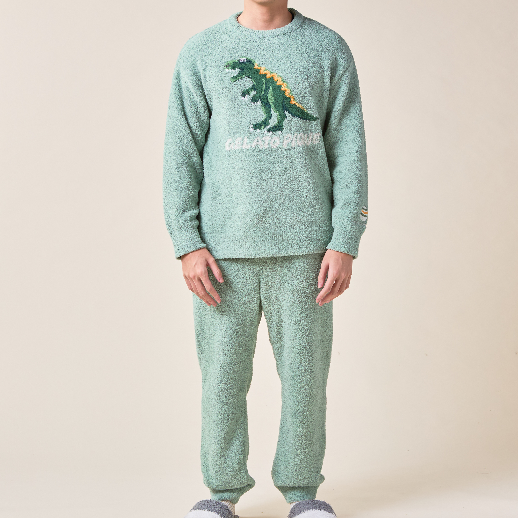 “大人のデザート”をコンセプトにした人気ブランド【gelato pique】の上下セットのルームウェアです。短毛でさらりとした心地良い肌触りが続くパウダー素材で作られた、POPなティラノサウルスのモチーフデザインで快適なお家時間を。