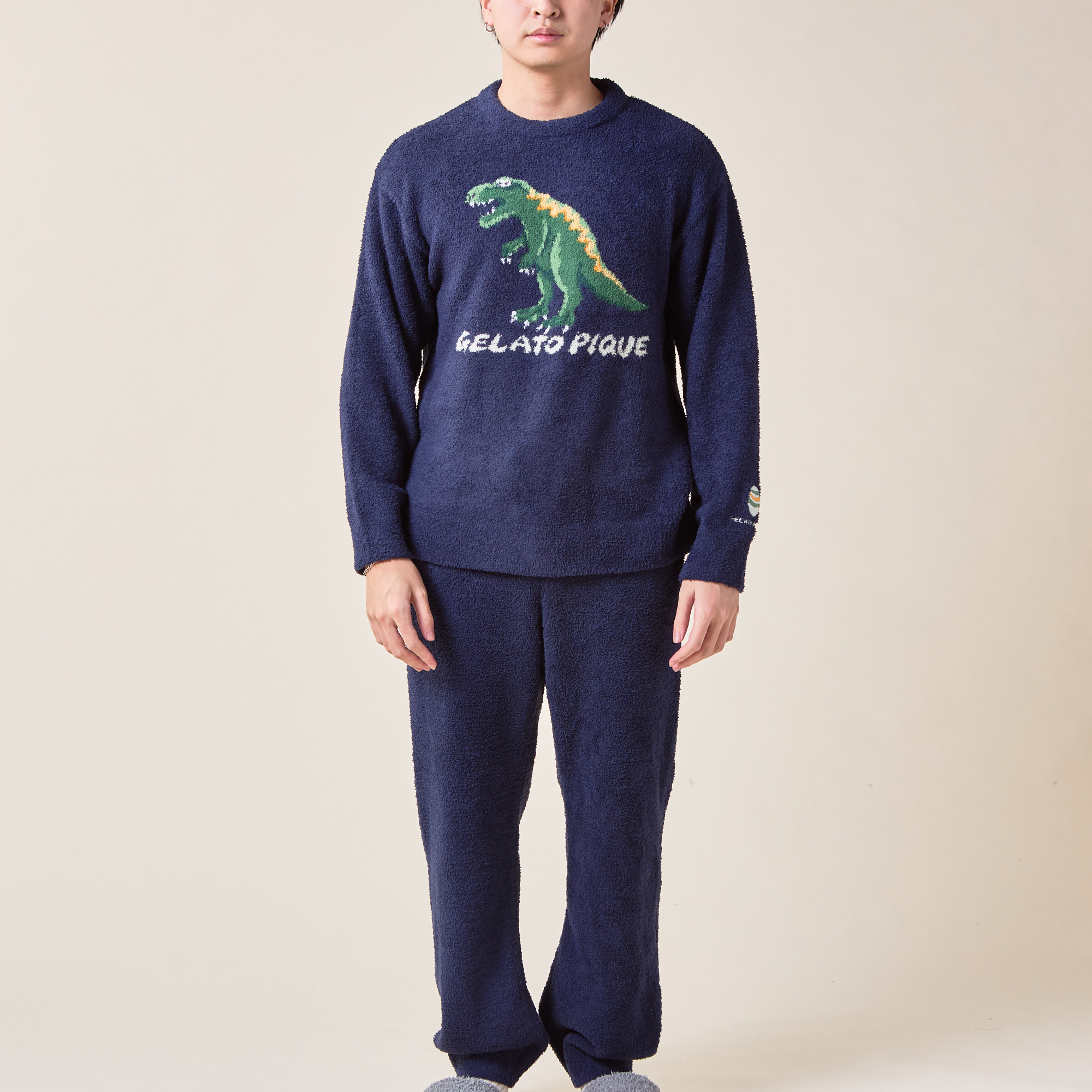 大口注文・法人のお問い合わせはこちら「gelato pique(ジェラートピケ)」のパウダーダイナソー ルームウェア。POPなティラノサウルスのモチーフがおうち時間を明るく彩ります。短毛でさらりとした心地良い肌触りが続くパウダー素材を使用しました。大切な方への贈り物にいかがでしょうか。