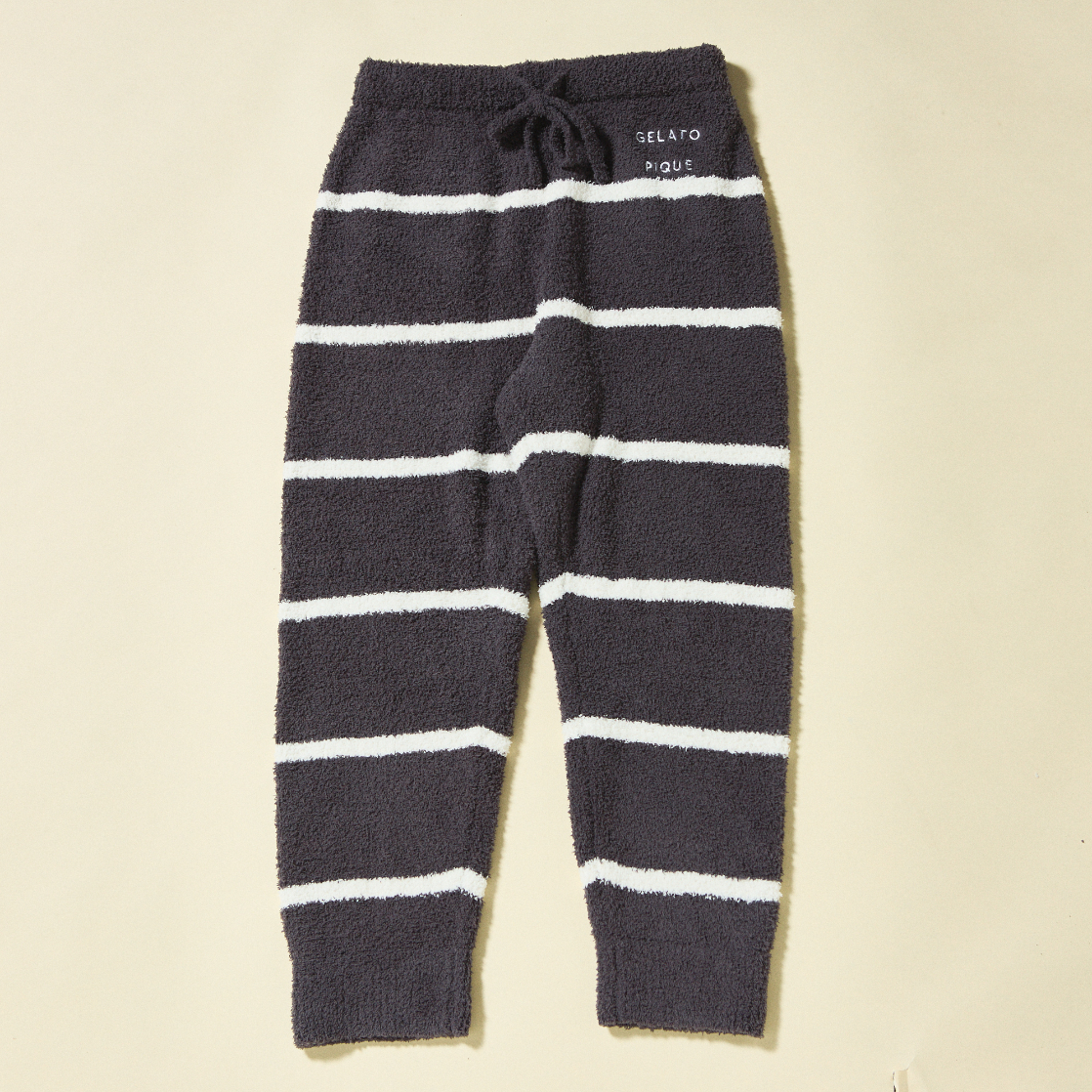 ボトムは暖かさを逃しにくい裾しぼりシルエットのパンツに、大人カジュアルな細ボーダーをあしらいました。