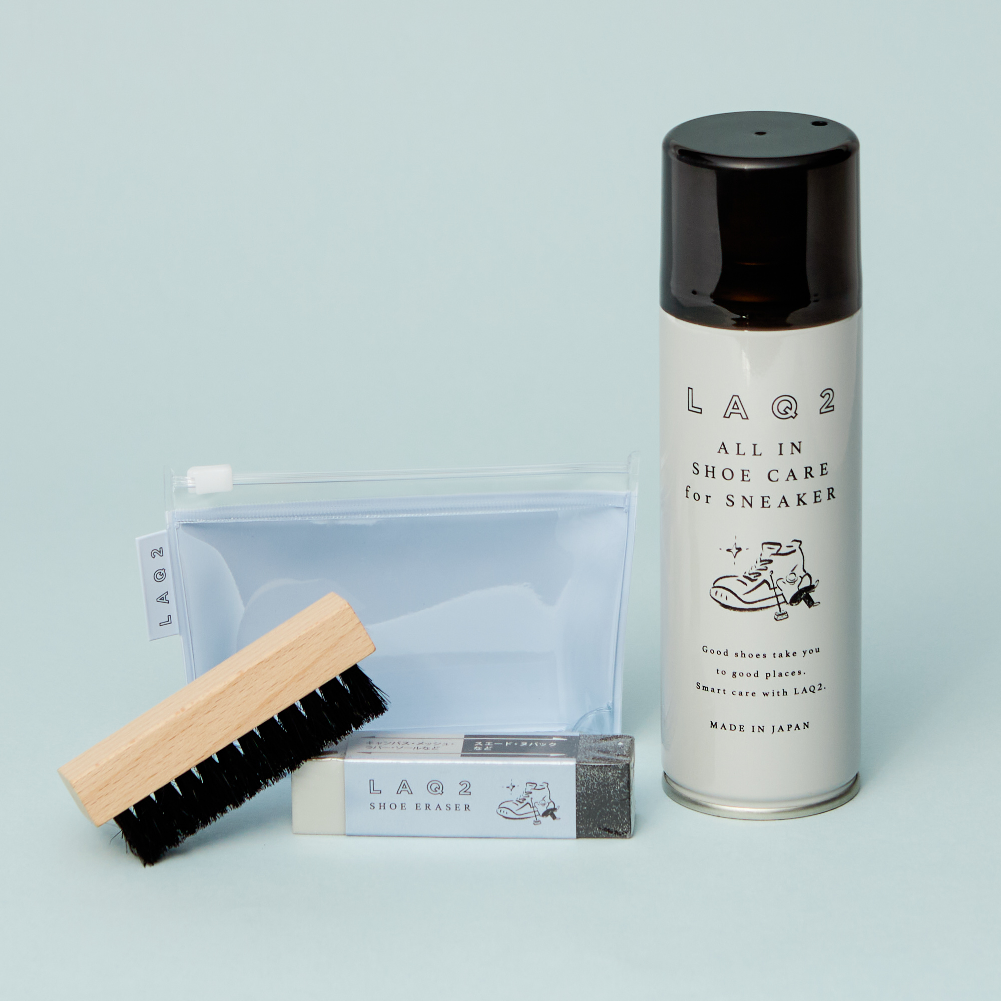 「LAQ2(ラクツ)」のシューイレーサーとオールインシューケアforスニーカーともに、スニーカーの汚れを水なしで優しくさっぱりと落とします。綺麗に長く履きたい大切なスニーカーだけど、ケアの方法が分からない方や女性でも使いやすいスニーカーケアセットです。BOXに入れてお届けします。