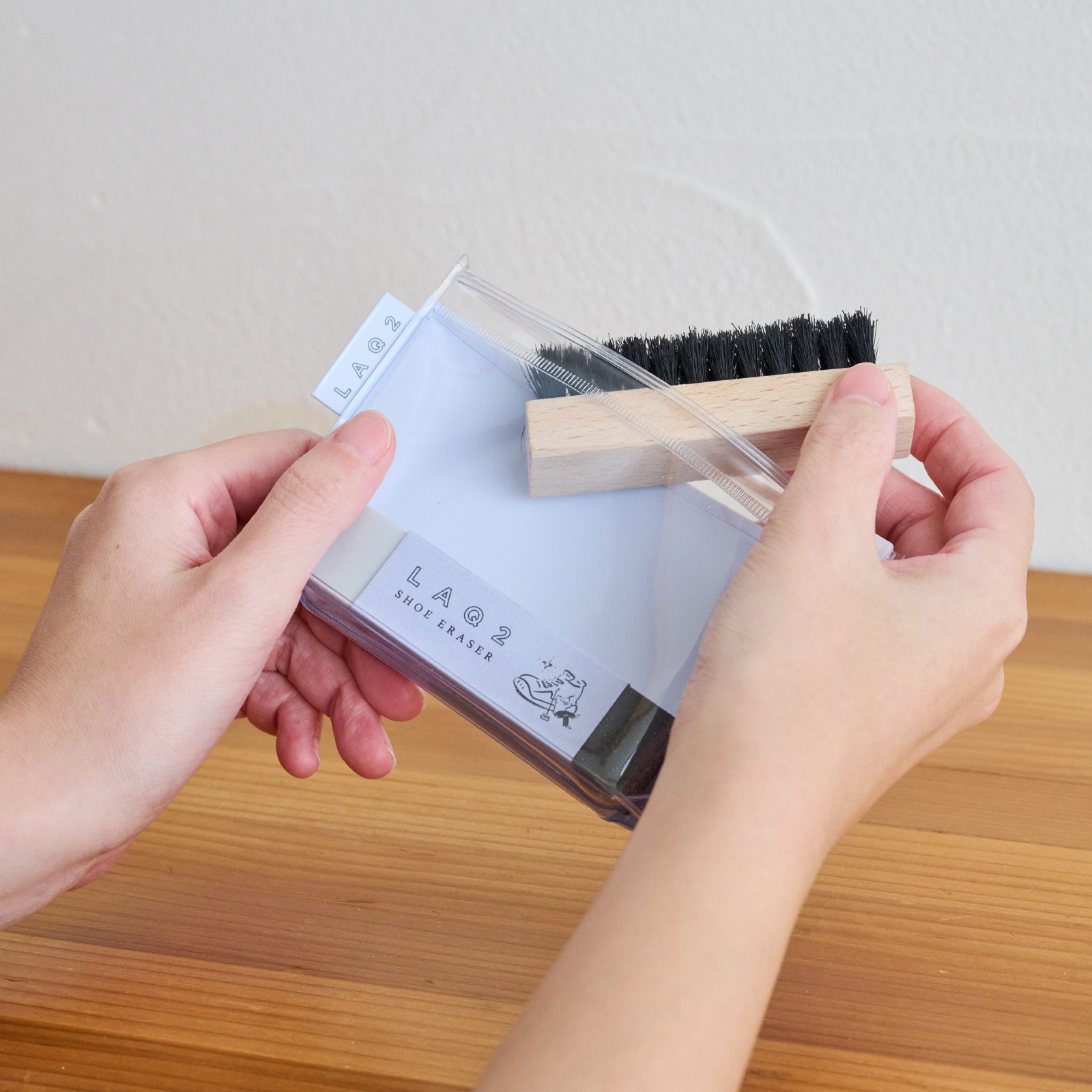 靴の汚れを気にすることなく、どんな場所でも即座にケアが可能なLAQ2のシューイレーサー。特殊な消しゴムがアッパーからソールの汚れを効果的に除去し、付属のミニブラシで消しカスを簡単に払い除けます。これにより、靴の美しさを維持し、長く愛用できるようになります。