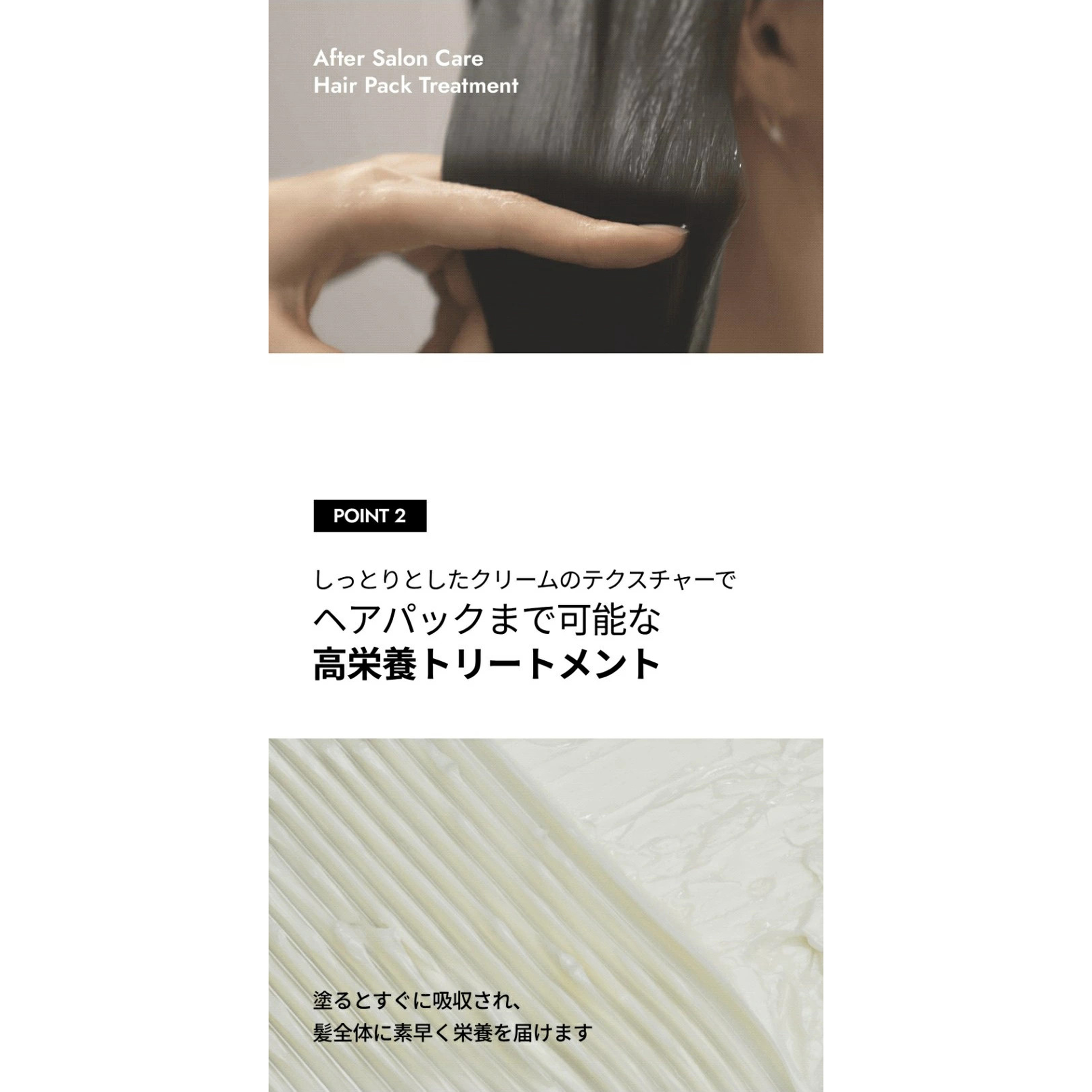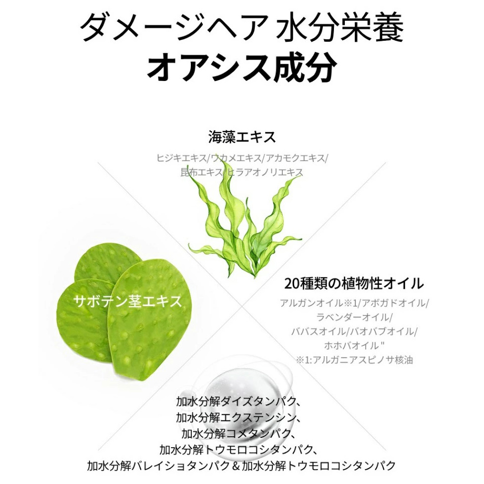 | 成分 | 水、セテアリルアルコール、ジメチコン、シクロペンタシロキサン、ベヘントリモニウムクロリド、ベヘントリモニウムメトサルフェート、PG、アモジメチコン、(C12-14)s-パレス-7、フェノキシエタノール、加水分解水添デンプン、アミノプロピルジメチコン、ツバキ種子油、イソプロパノール、イソノナン酸エチルヘキシル、BG、ベヘニルアルコール、加水分解ダイズタンパク、加水分解トウモロコシタンパク、加水分解コムギタンパク、ヒジキエキス、ワカメエキス、ホンダワラエキス、マコンブエキス、ヒラアオノリエキス、オプンチアフィクスインジカ茎エキス、カノラ油、アルガニアスピノサ核油、アボカド油、ヒマシ油、ブドウ種子油、ヒマワリ種子油、マカデミア種子油、オリーブ果実油、ローズマリー葉油、ラベンダー油、月見草油、アンズ核油、レプトスペルムムペテルソニイ油、バオバブ種子油、ババス油、ワサビノキ種子油、アサイヤシ果実油、ユーカリ葉油、ホホバ種子油、ベタイン、乳酸、グリセリン、コカミドMEA、EDTA-2Na、酢酸トコフェロール、PEG-14M、香料 |