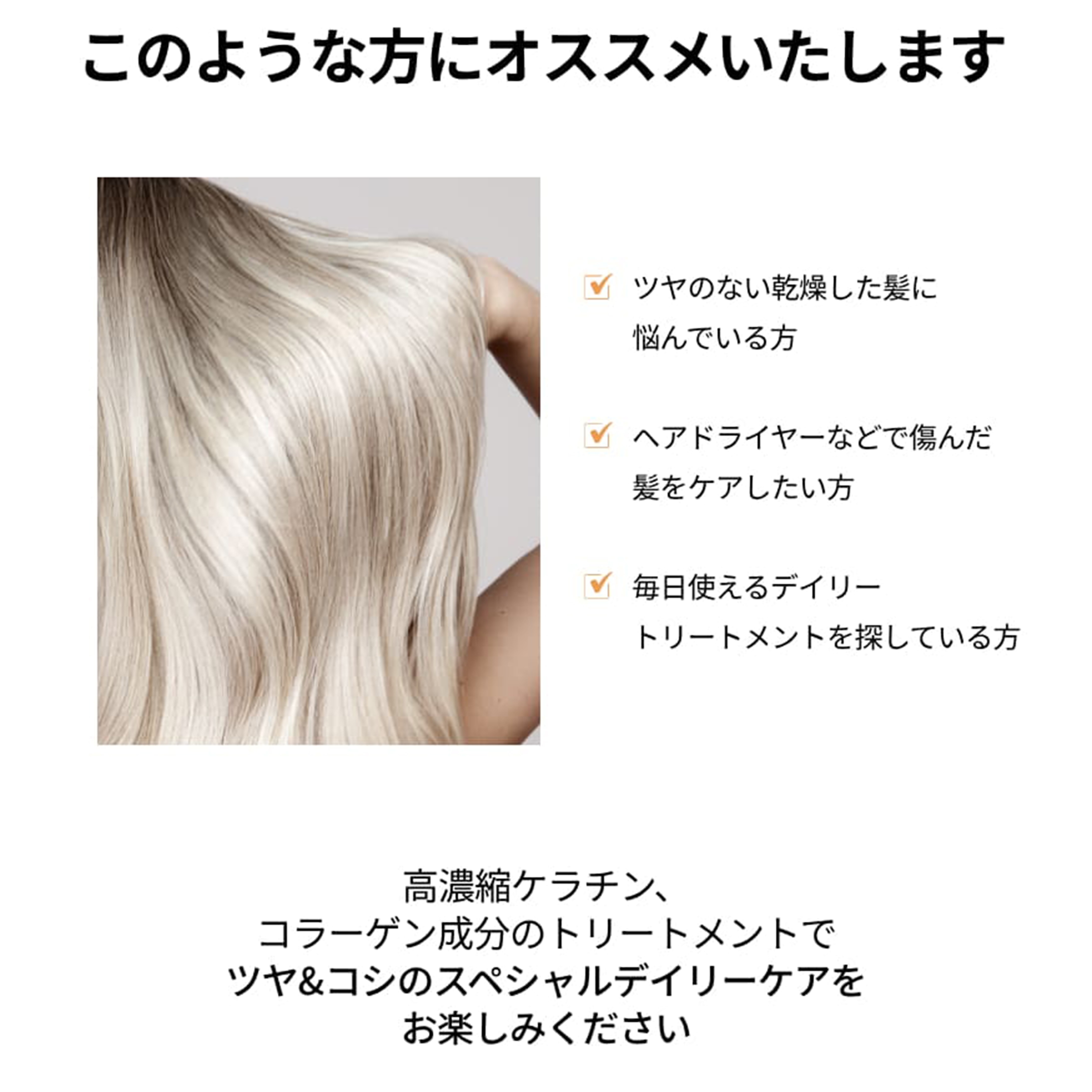毎日サロン帰りのツヤ髪を実感!98%自然由来のヘアトリートメント。ドイツダーマテスト認証取得で敏感肌にも安心の低刺激ケア。 高濃縮ケラチン、コラーゲン成分のトリートメントでツヤ&コシのスペシャルデイリーケアをお楽しみください。
