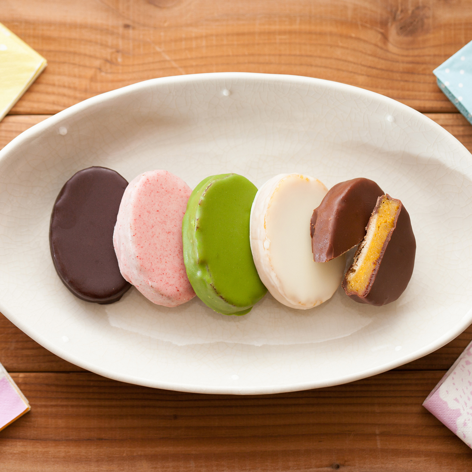 大口注文・法人のお問い合わせはこちら種子島産の安納芋を贅沢に使用したスイートポテトを5種類のチョコレートでコーティングしました。安納芋のクリーミーな甘さとチョコレートがたまらない。甘味と食感のハーモニーが絶妙の大人気商品です。プレーン、ホワイト、抹茶、苺、キャラメルの5種類のチョコレートをお楽しみいただけるセットをご用意しました。