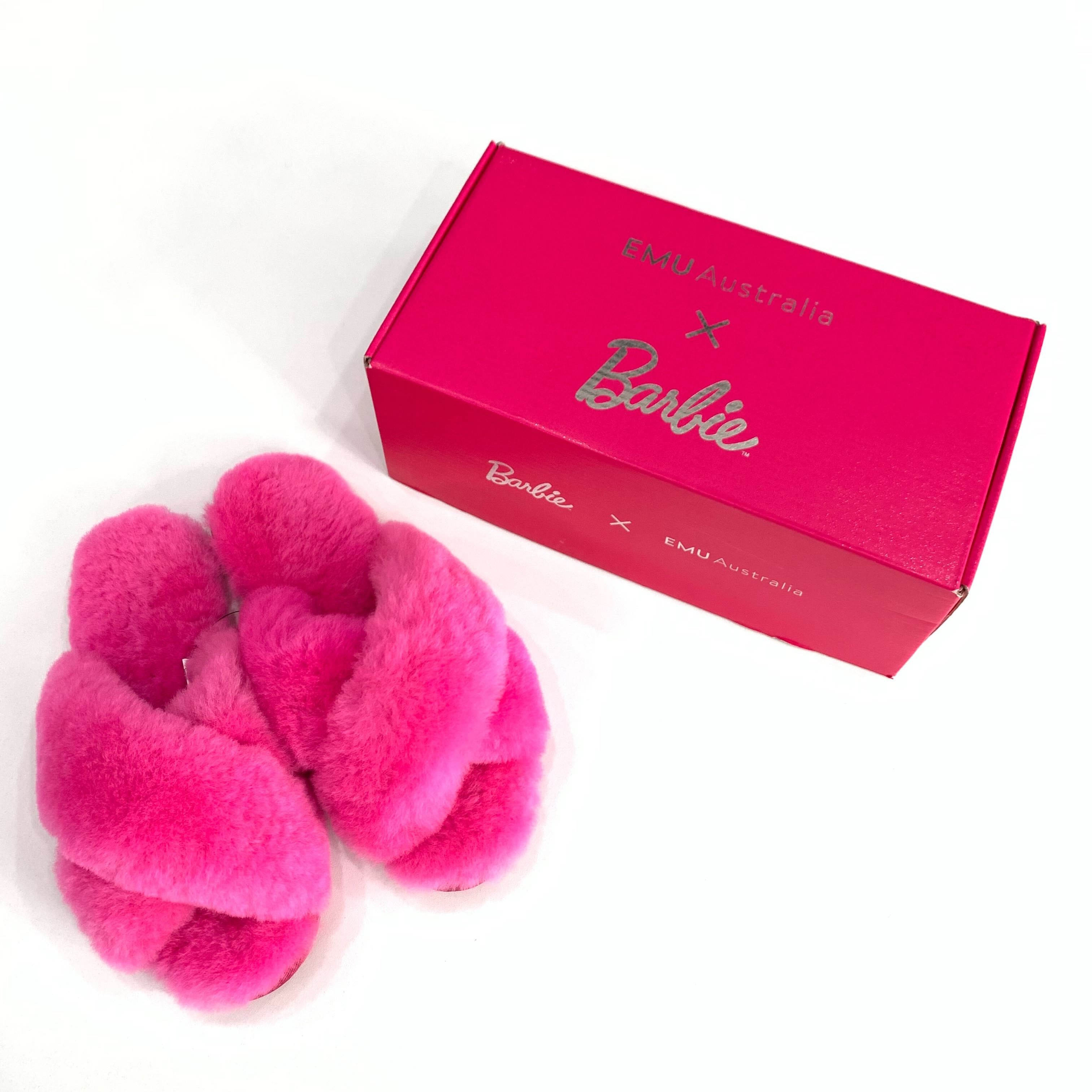 あの世界的人気バービー人形とのコラボレーションアイテム。EMUファーサンダル【MAYBRRY】をバービー特別カラーにしました。