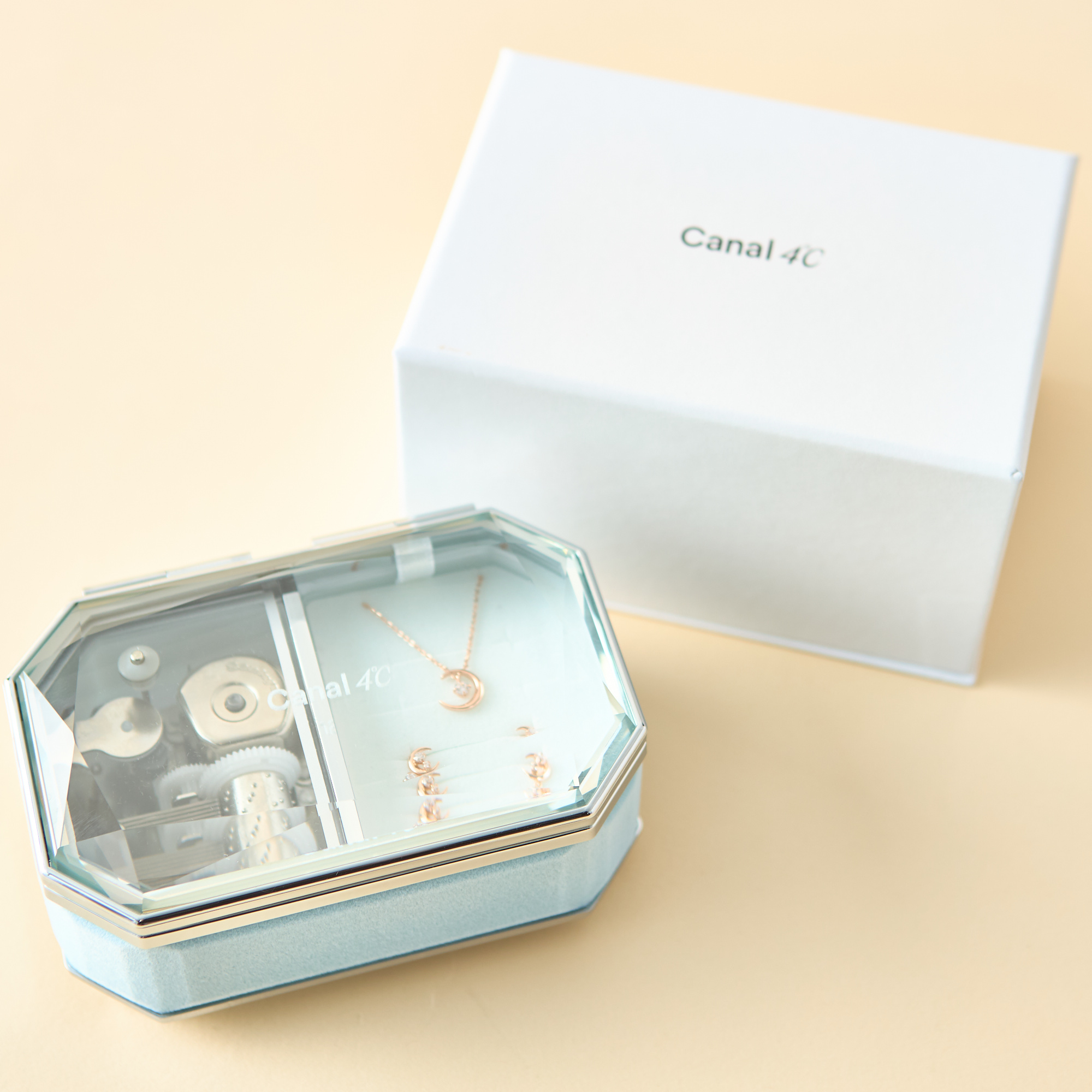 女性らしさを引き立てるといわれるネックレスと揺れながらきらめくキュービックジルコニアを添えたピアスをオルゴールケースとセットにしてお届けします。ネックレスはシンプルながらも華やかさのあるデザインでピアスはピンクゴールドの柔らかな輝きが、耳元を可憐に彩ります。