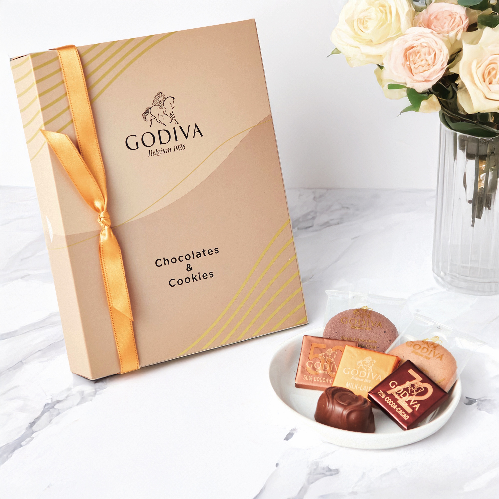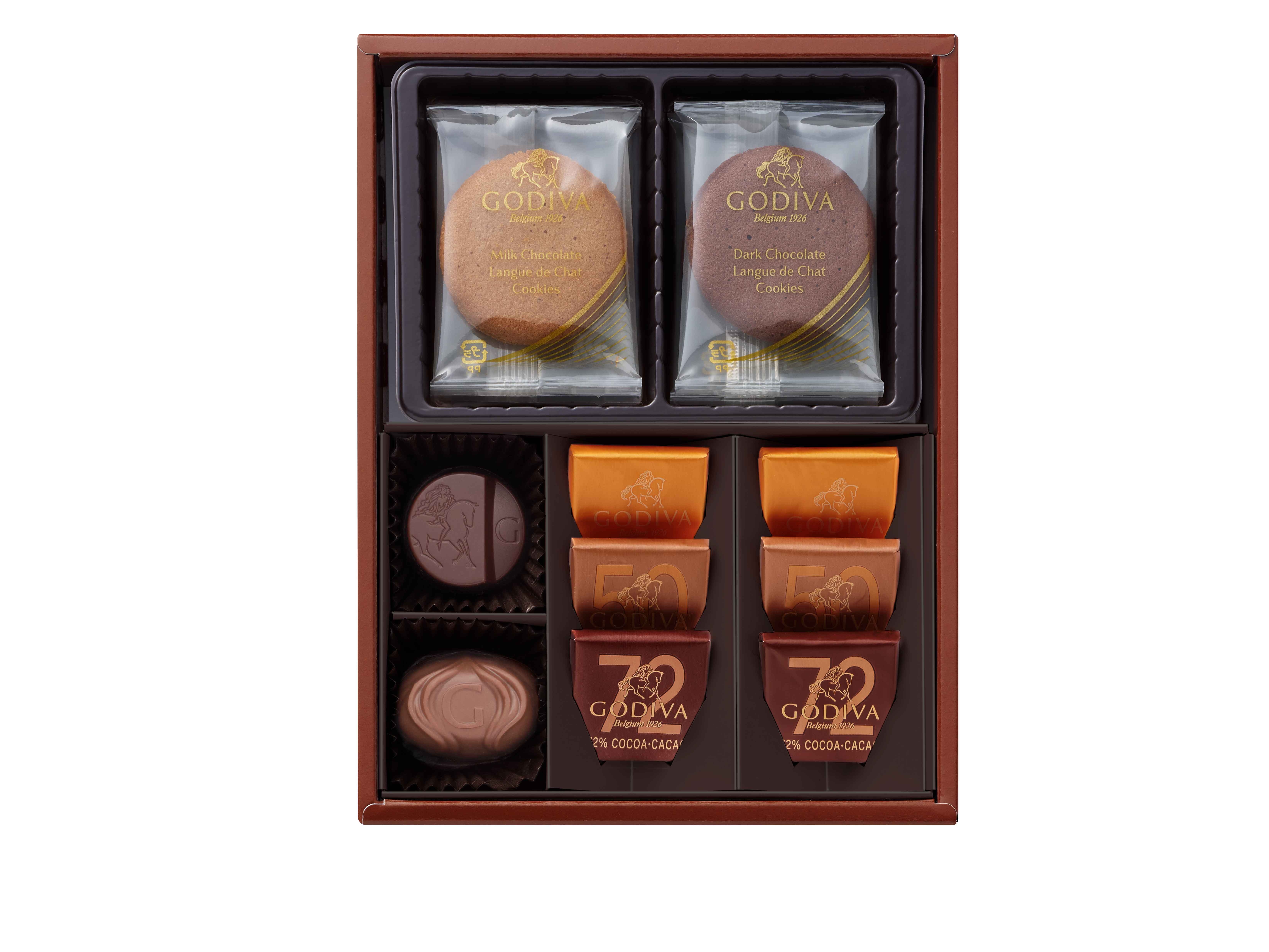 選び抜かれたチョコレートとスクエアタイプのシンプルなカレ、チョコレートをサンドしたラングドシャクッキーなど、ゴディバのバラエティ豊かな商品を詰め合わせました。お中元やお歳暮、ビジネスシーンでの贈り物にもおすすめです。