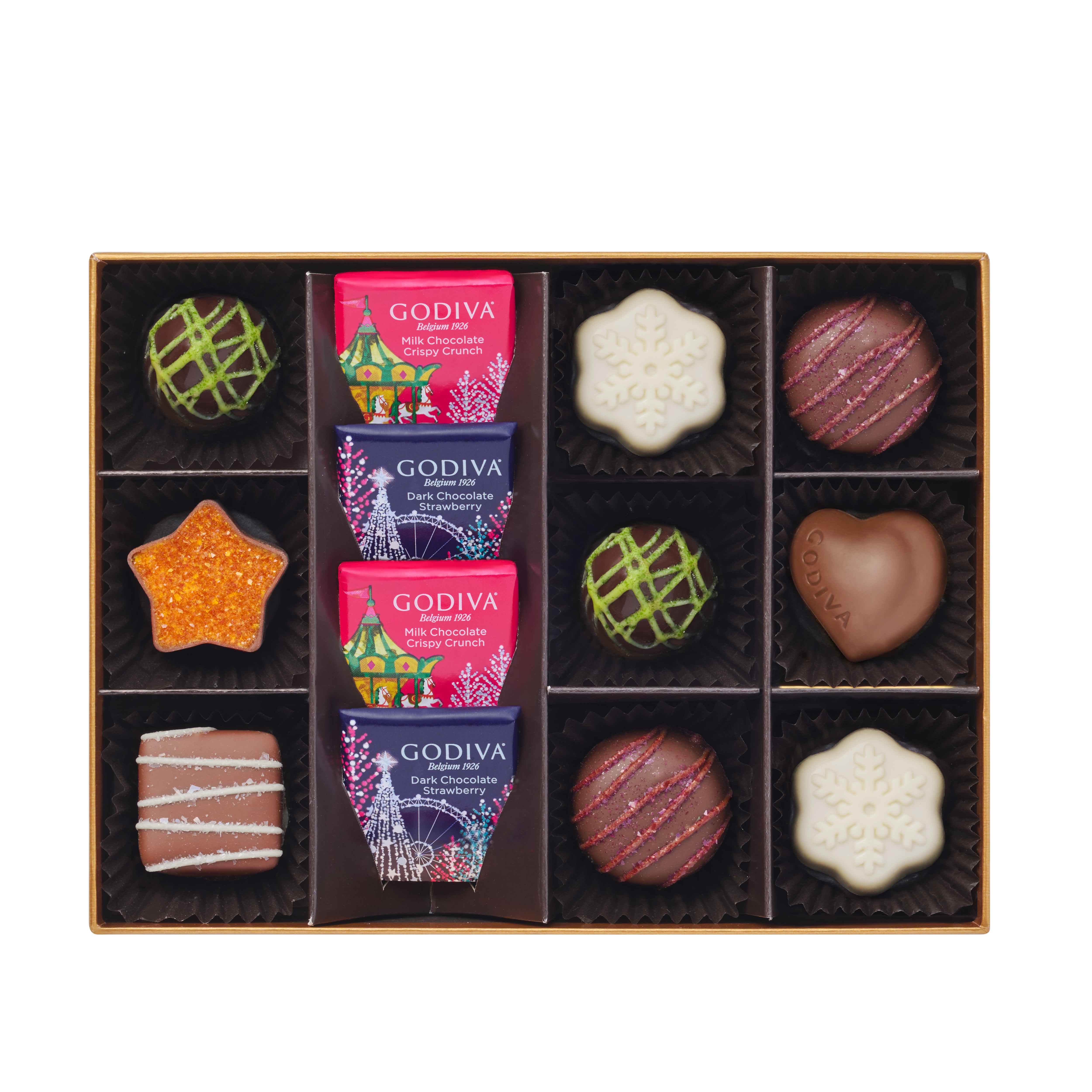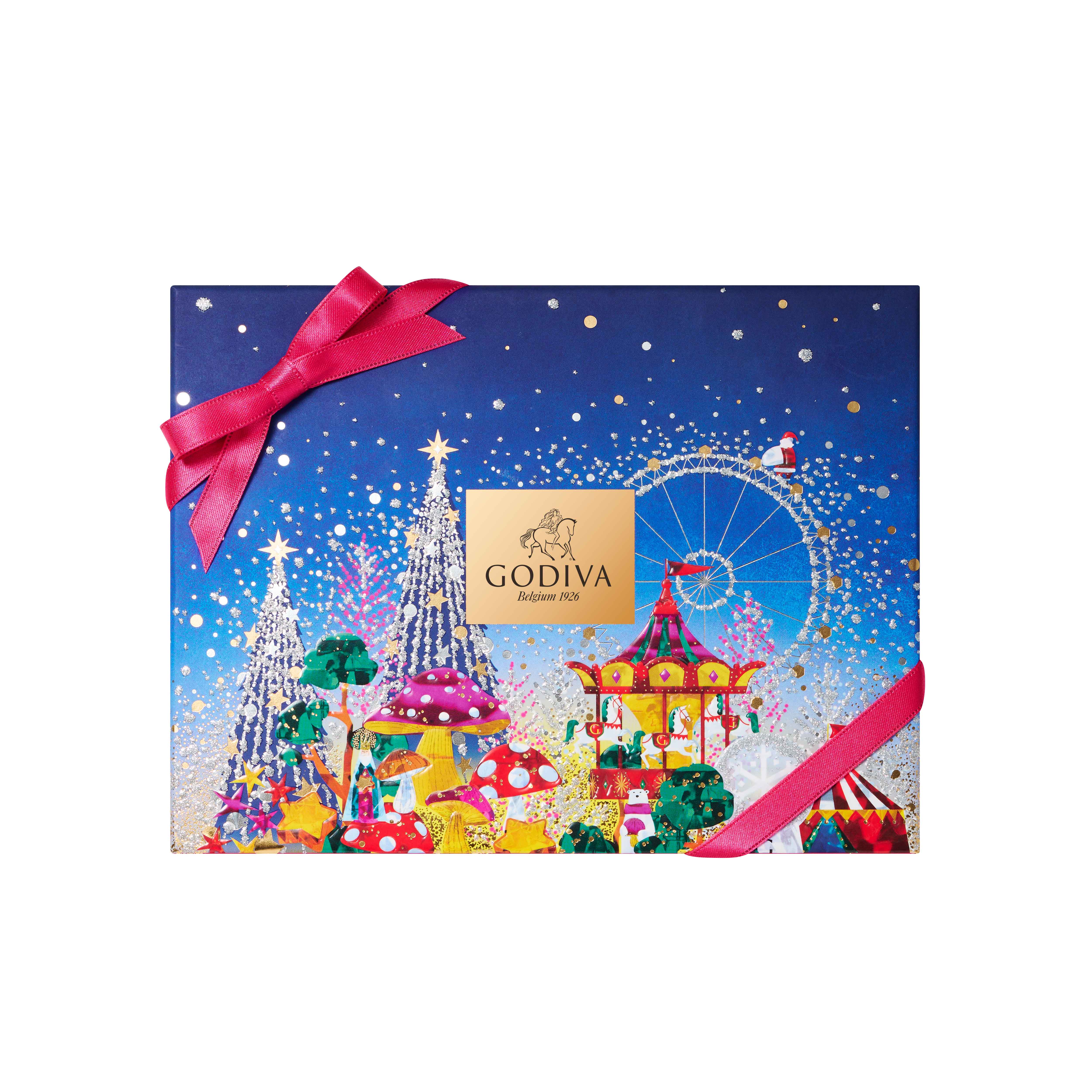 大口注文・法人のお問い合わせはこちら2024年ホリデーコレクションのテーマは、ブリュッセルのクリスマスマーケット「ウィンターワンダーズ」。 ホリデーシーズンにグランプラス広場で開催される光と音のショー。 ミニ観覧車や遊園地も出現。多くの人々が集まり楽しみながら、クリスマスを待ちわびます。 そんなハッピーな「ウィンターワンダーズ」の情景を描いたパッケージに、夜空に輝く星や、舞い散るスノーフレーク、もみの木などをイメージした限定チョコレートを詰め合わせました。