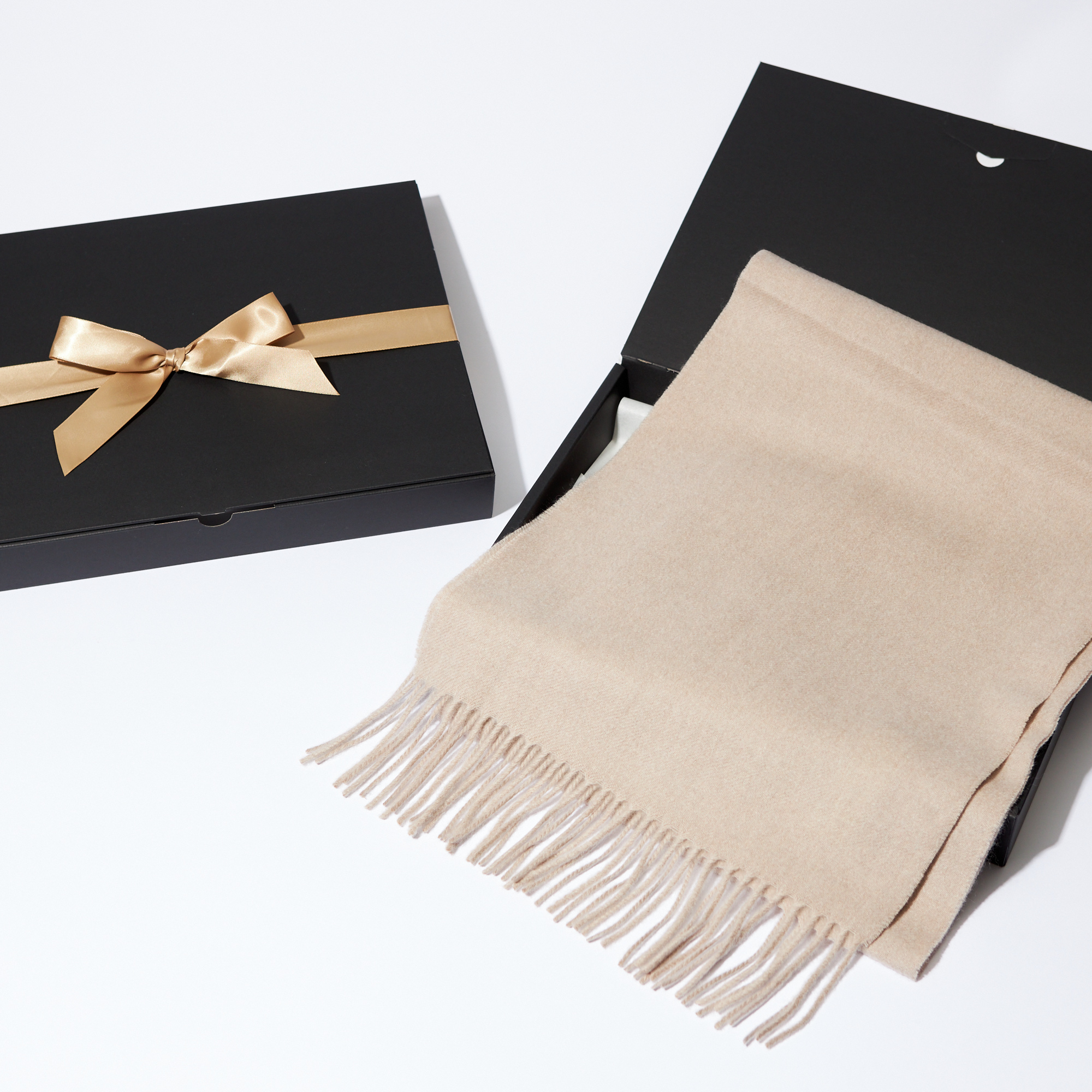 大口注文・法人のお問い合わせはこちら有料でマフラー専用BOXをご用意しております。 ブラックのシンプルなBOXにゴールドのリボンをおかけします。 (リボンの色が異なる場合がございます)