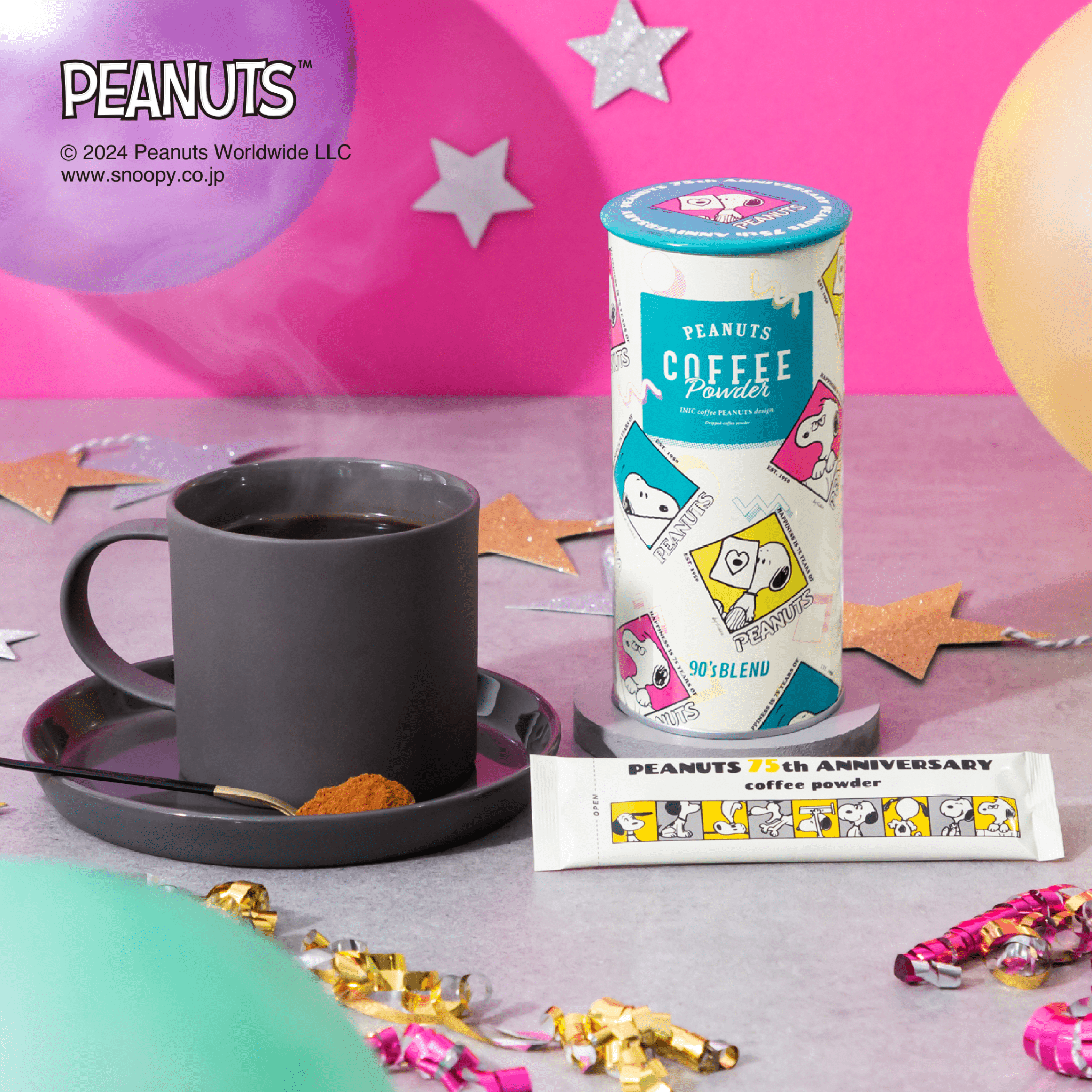 2024年10月からPEANUTSコミック誕生75周年アニバーサリーイヤーが始まります。PEANUTS COFFEEからは各年代を想起させるオリジナルブレンドコーヒーが登場。各年代のイラストと当時のアメリカのコーヒー(イメージ)を再現しました。