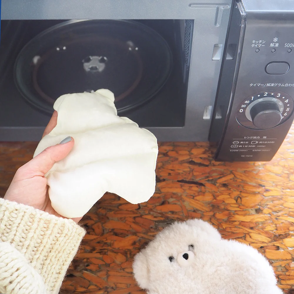 取り出した保温剤を耐熱皿などにのせて、レンジでチンして使います。くまのカバーは手洗いも可能。清潔に、繰り返し使うことができるエコなアイテムです。