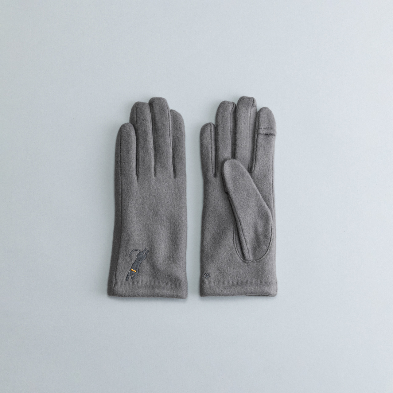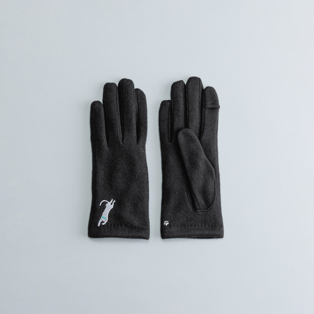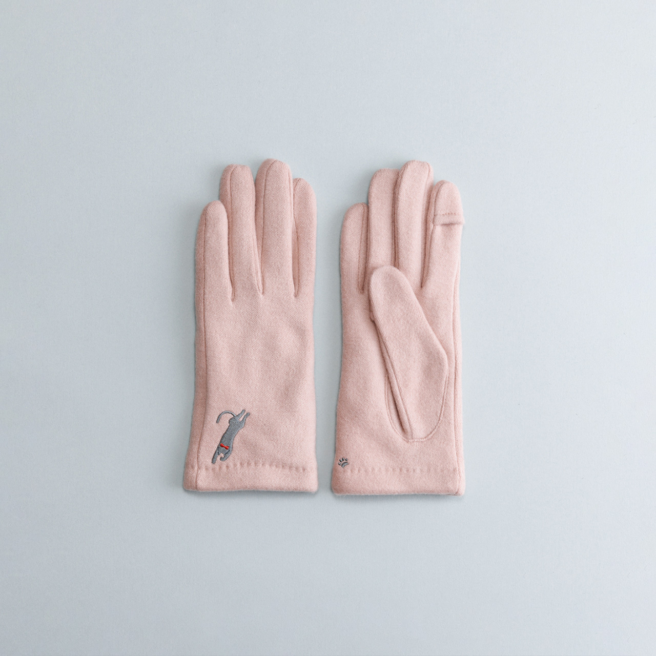 おひるね中の猫が可愛いジャージグローブ。掌には猫の足跡を刺繍。裏地は暖かなボア素材を使用しています。また指先がスリットでスマホ操作も楽々です。