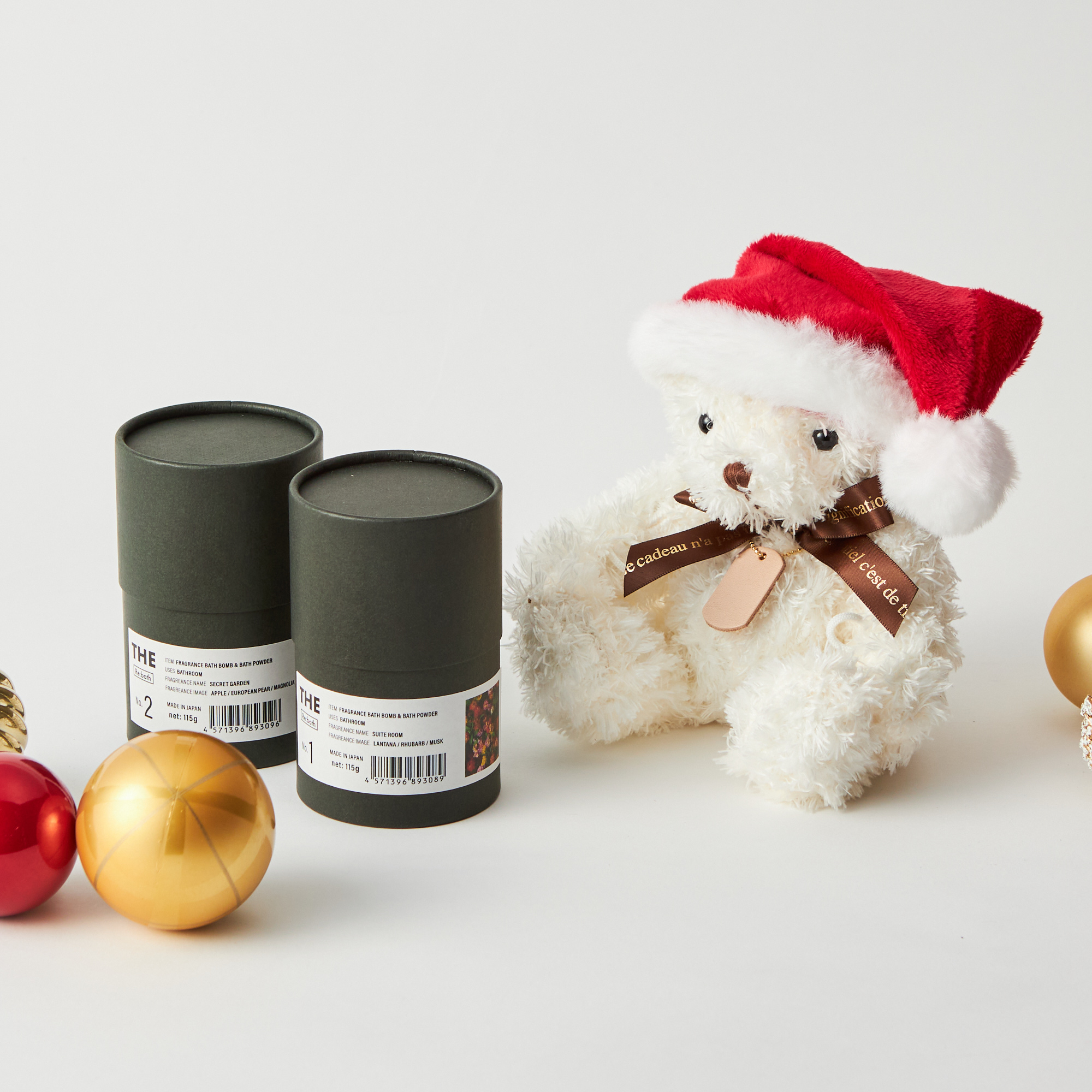 刻印ができるチャームがついたサンタテディベアと「THE STORE(ザ ストア)」の人気フレグランスバスボムのセットです。