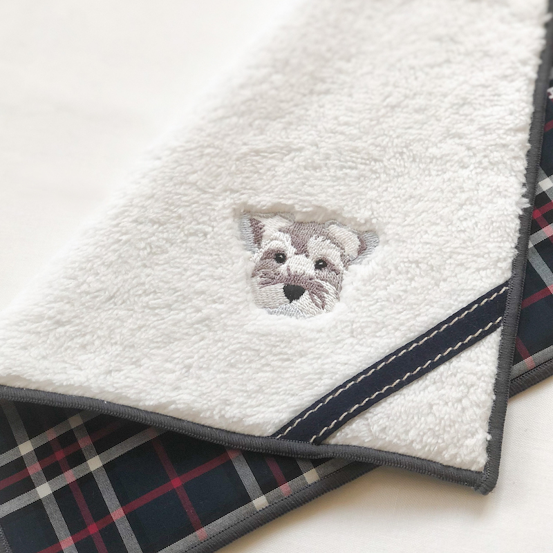 表はオリジナルのマイクロファイバーボアにワンちゃんの刺繍が映えます。 裏は浜松や播州の先染めの生地になっています。 タータンチェックやストライプなど、ボアと柄のありそうでなかった組み合わせです。