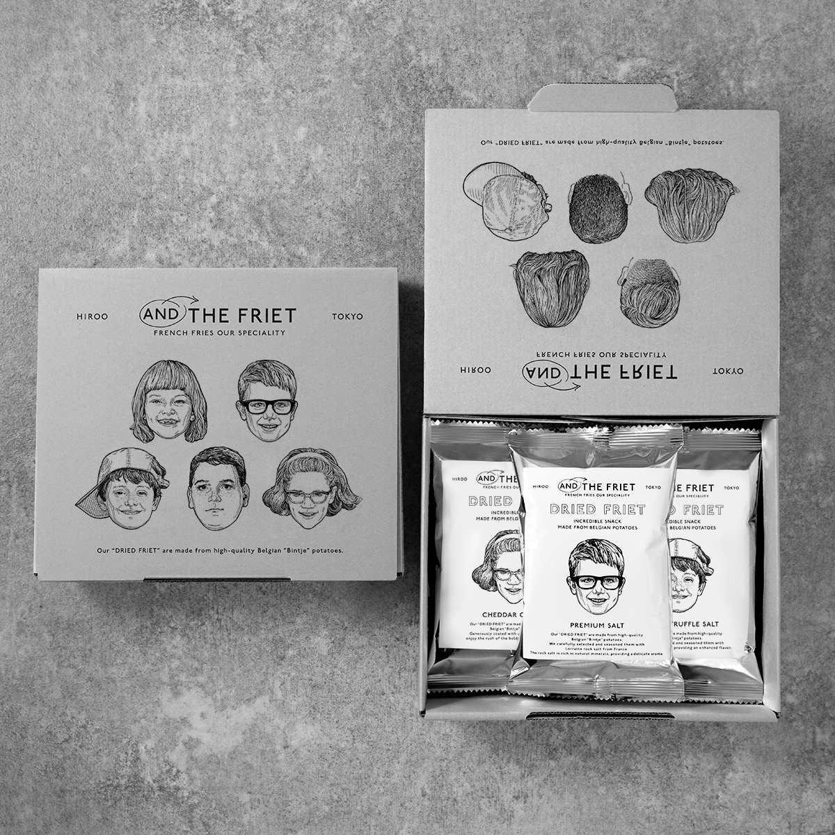 AND THE FRIET(アンド ザ フリット)がこだわって世界各国から取り寄せたフレンチフライの素材をそのまま加工し、特殊なフライヤーでゆっくり時間をかけてサクサクの食感を引き出すことにより、素材の良さとおいしさを活かしました。 パッケージはアートディレクター平林奈緒美氏のデザイン。ヨーロッパのイラストレーターAnje Jager氏による子どものイラストが描きおろされています。 2種類の詰め合わせから1つお選びいただけます。