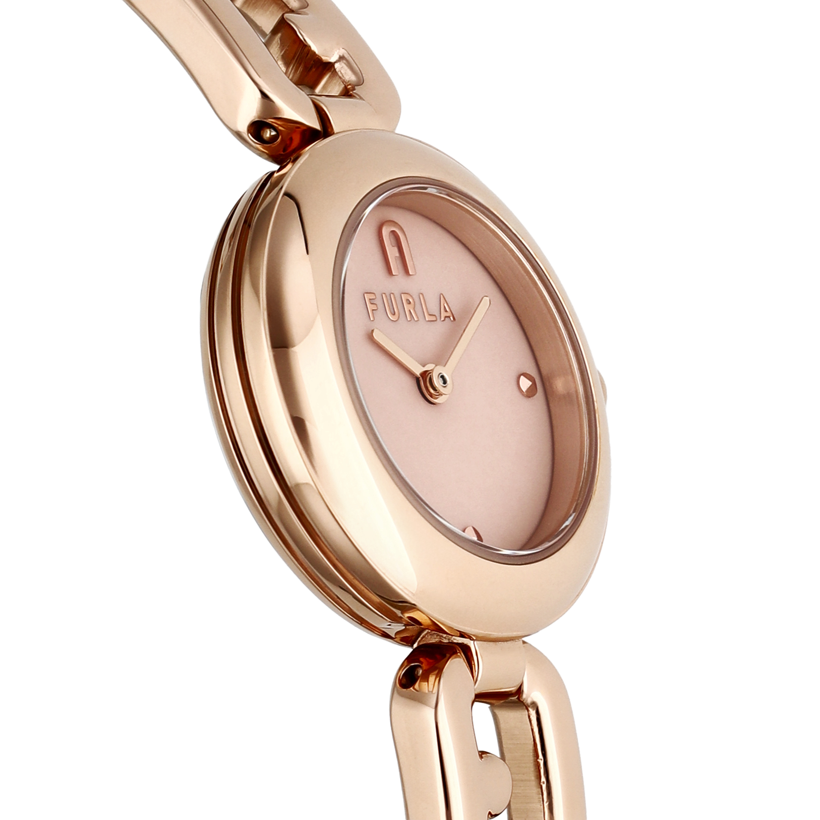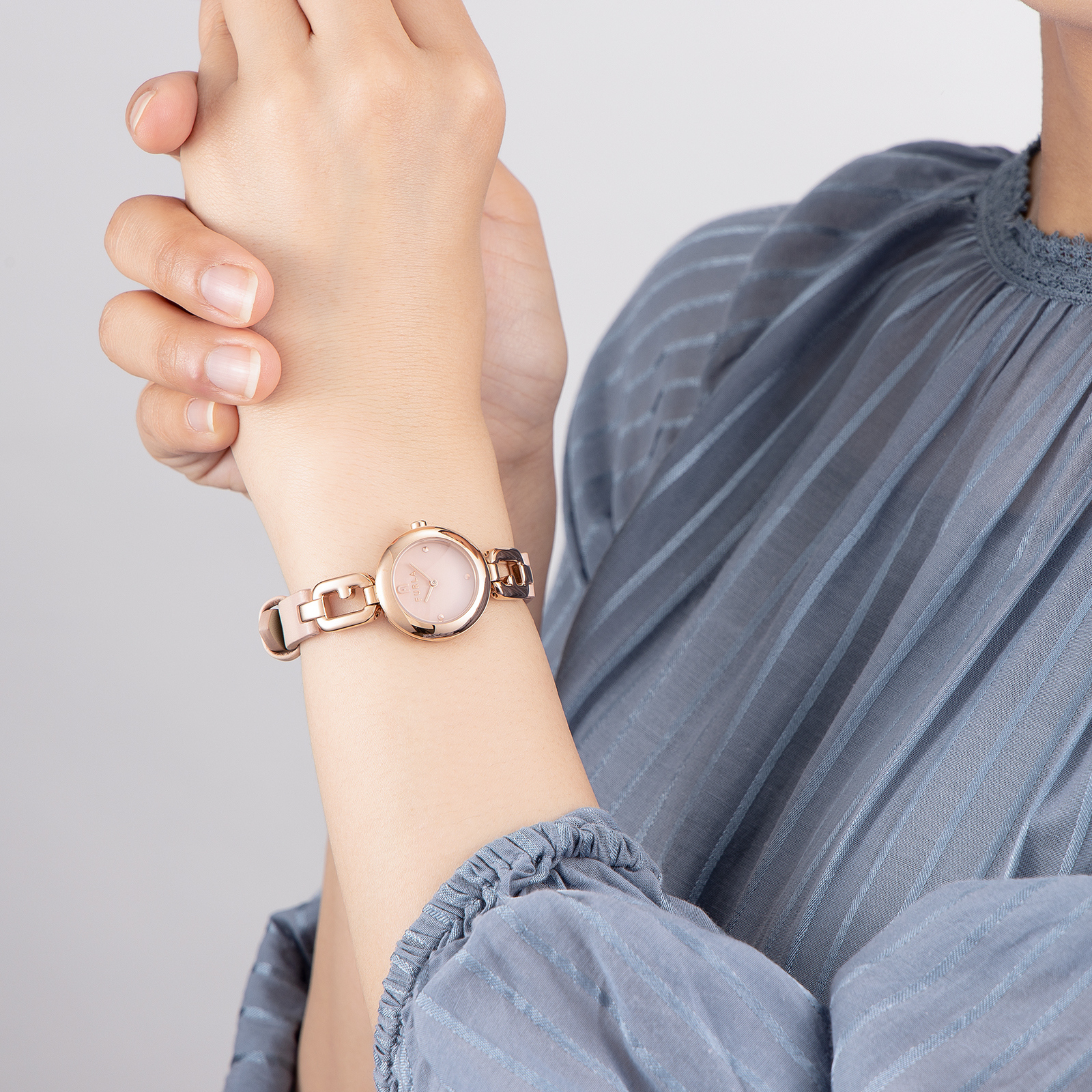 透け感のあるオープンアーチロゴの装飾が腕元をきらびやかに演出。どこから見てもフルラの腕時計だと認識できます。 アクセサリー感覚で着用できるので、スタイリングにフェミニンなニュアンスを加え、コーディネートを大人の甘さに。