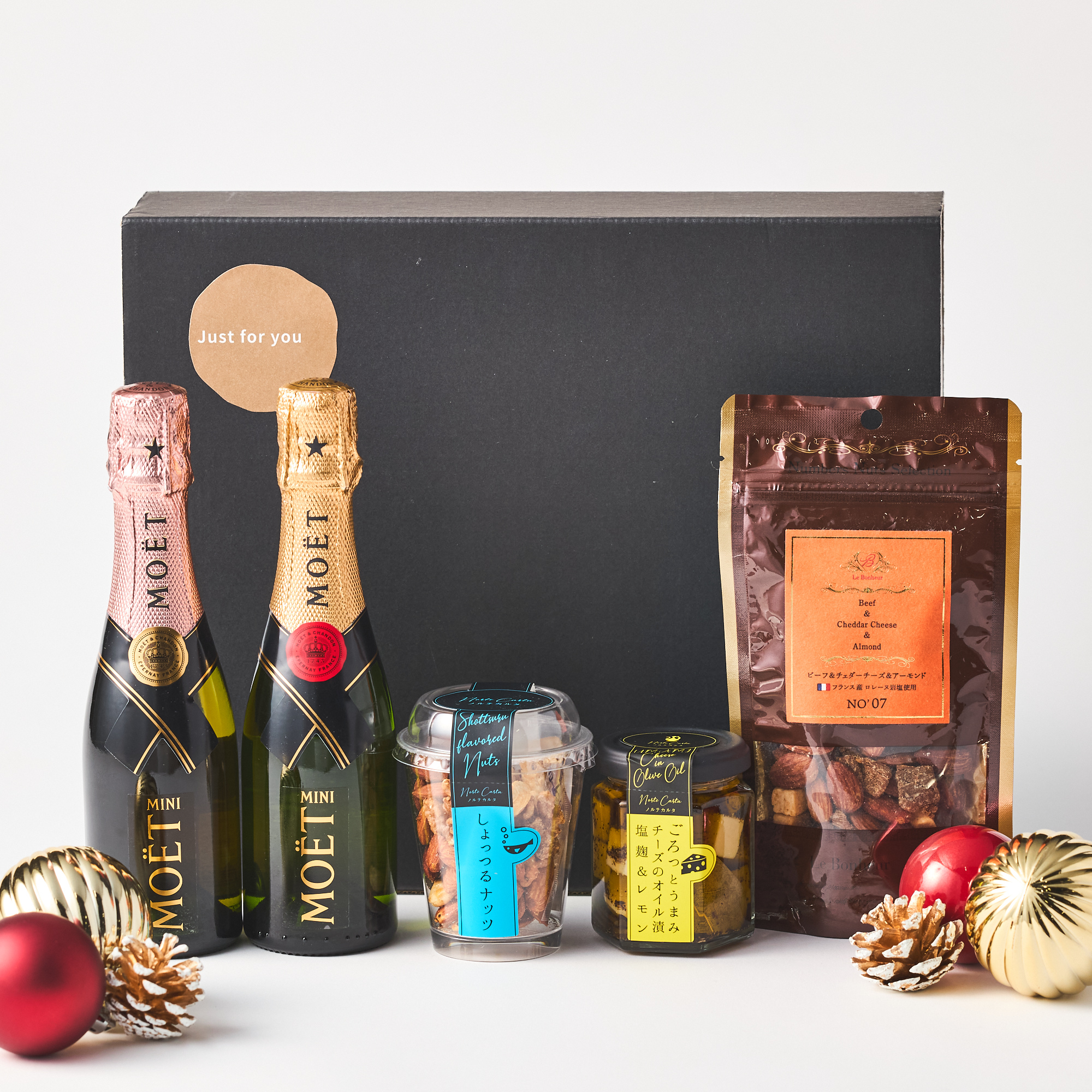 大口注文・法人のお問い合わせはこちら飲みきりサイズのミニサイズのモエアンペリアル(通称 ミニモエ)と、エキストラヴァージンオリーブオイルで味付けしたミックスナッツや3種類のスナックを詰めたスナック菓子から選べるナッツと、2種類から選べるチーズのオイル漬のセットのです。 ※ミニボトルシャンパン2本、しょっつるナッツ1点、ミックスナッツ1点、チーズのオイル漬1点のセットです。 ※20歳未満の方への酒類の販売はいたしません。