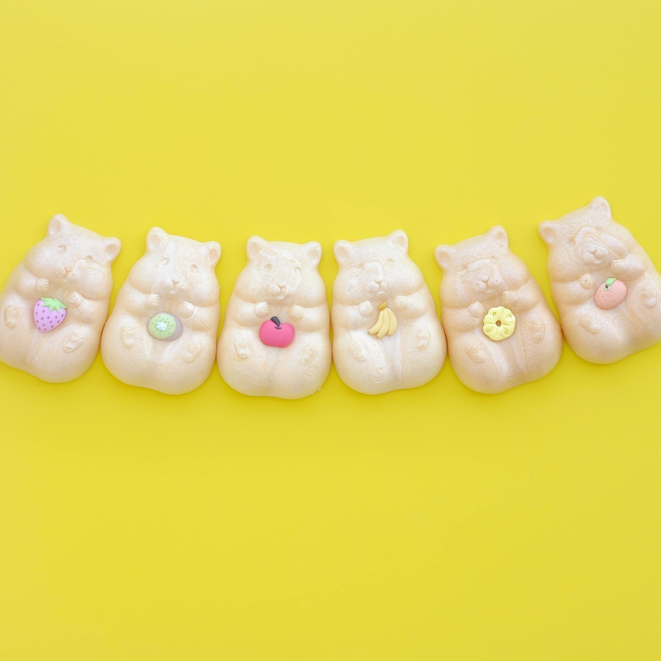 ハムスターのおなか部分が少しくぼんでおり付属の砂糖菓子を置くと、まるでハムスターがフルーツを持っているように⾒えます。 パリッと⾹ばしいモナカがなんとも⾔えないハーモニーで、⾒た⽬だけでなく美味しさにもしっかりこだわった商品です。