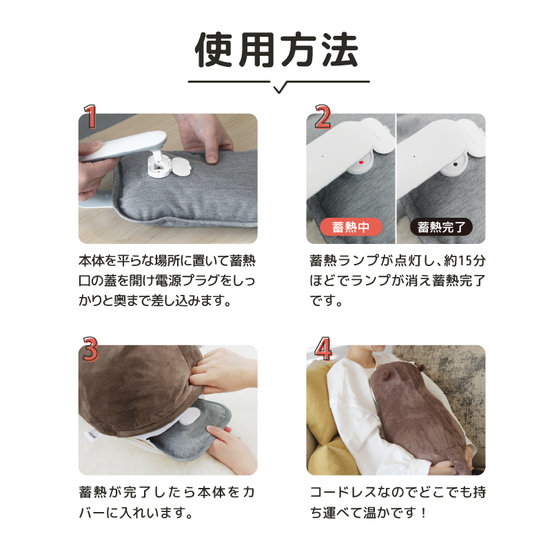 湯たんぽとして、ぬいぐるみとして、大きいサイズでほどよい抱き心地。お湯の入れ替えが不要で約15分で最長7時間まで温かさを実感できます。カバーは選択ができるのでいつでもお手入れ簡単です。