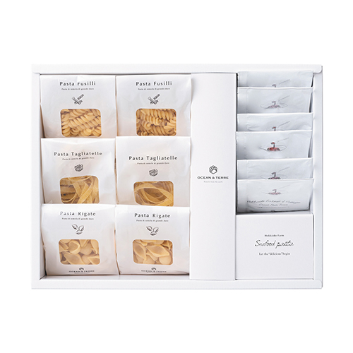| 内容量/数量 | 北海道産サケとキャベツクリームパスタソース17.2g×4、北海道産トマトとズワイガニクリームパスタソース16g×2、アビッシーネ・リガーテ70g×2、ロングパスタ タリアテッレ50g×2、フジッリ・ブロンズ70g×2 |
