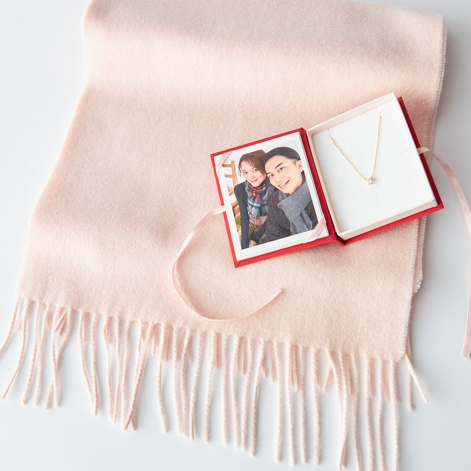 思い出の写真をパーソナライズできるボックス付きのモアサナイトが輝く一粒ネックレスと冬のギフトにぴったりなカシミヤ100%のマフラーをセットにしました。