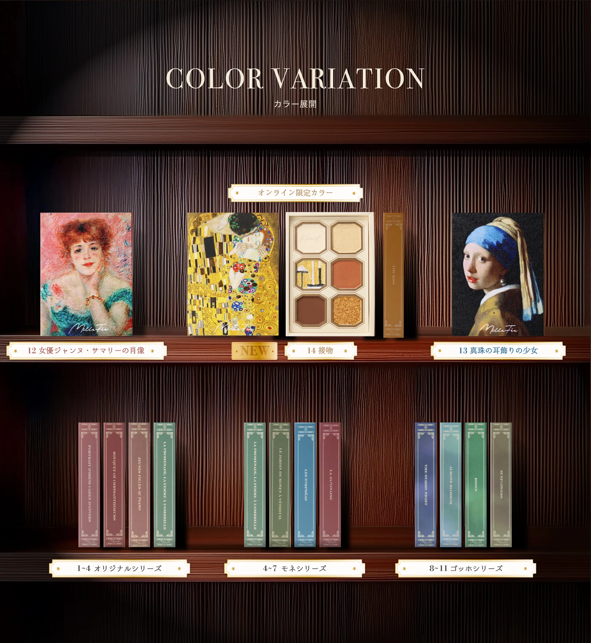 大口注文・法人のお問い合わせはこちら絵画からインスピレーションを得たアイシャドウパレットをご用意いたしました。 ブック型になっており、ケースからアイシャドウを取り出すと、まるで美術館に訪れたような精巧な油絵が目に飛び込んできます。 一度、本を開けば名画の世界に。
