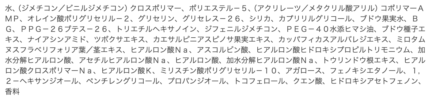 ヒアルロン酸でうるおいをチャージして保湿。エアコンや外の乾燥から肌を守ります。ブドウ種子エキスの力で肌のキメやくすみをケアしてなめらかな肌に。