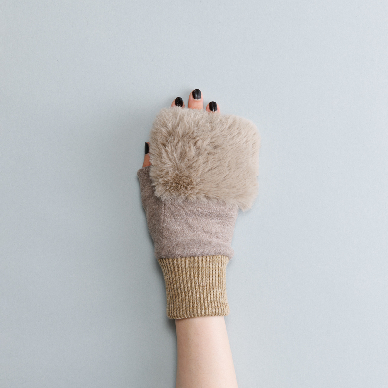 | フェイクファー付きフィンガーレスグローブ | 【外装サイズ】 幅14cm × 縦22cm × 4cm 【素材/繊維】 アクリル・レーヨン ファー部:ポリエステル100 % カフス部:アクリル100% 内側:マイクロボア < HF-1808B > 【お手入れ方法】 乾いた布で汚れを拭き取り、陰干しをしてください。 【サイズ】 21 - 22 cm |