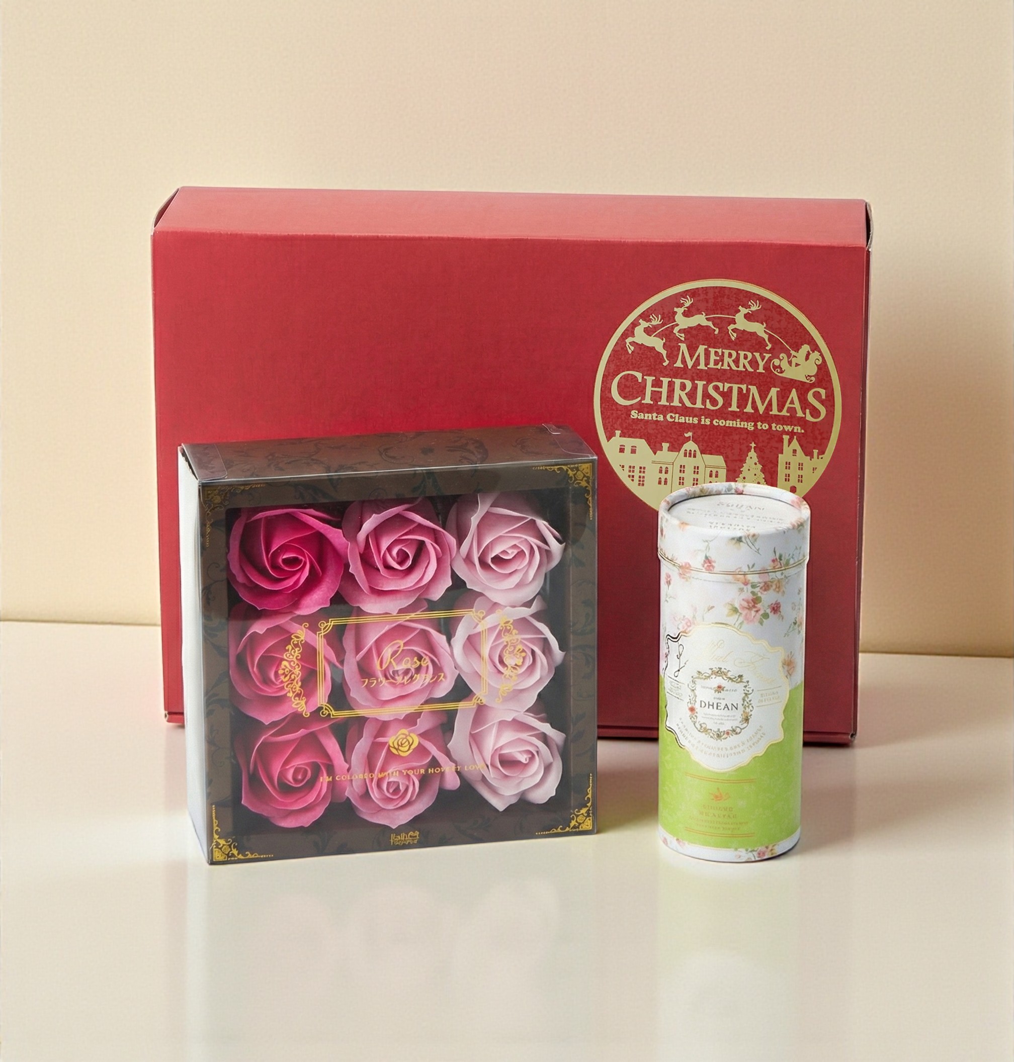 見た目も可愛らしい選べるラスクと、「フラワーギフトとして楽しんだ後に、使って終われる商品がほしい」というお客様の声から生まれたバスフレグランス「花のカタチの入浴剤」のギフトセット。飾った後は花びらを浮かべてバラ風呂のようにご使用いただけます。2色から選べるクリスマスデザインのギフトボックスに入れてお届けします。