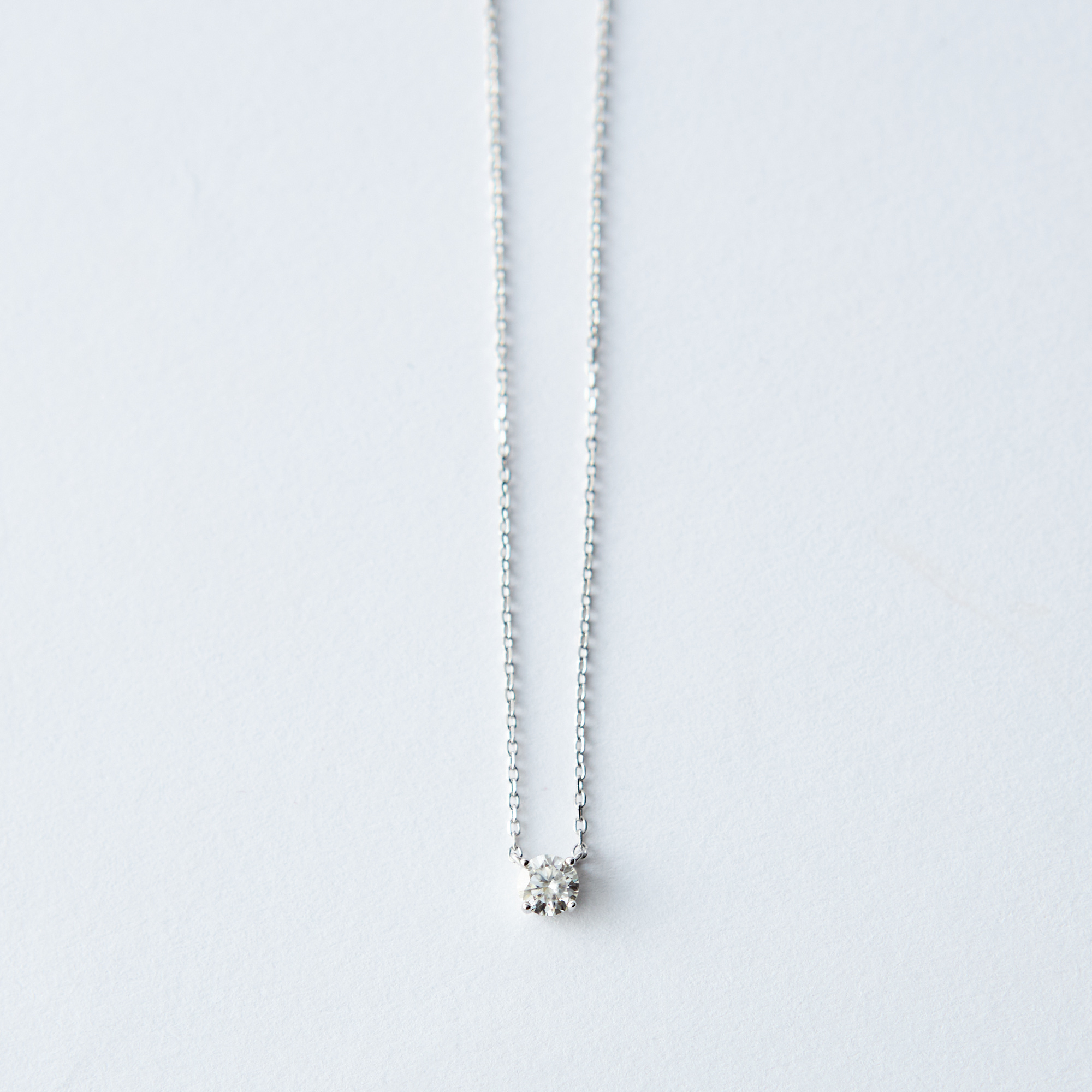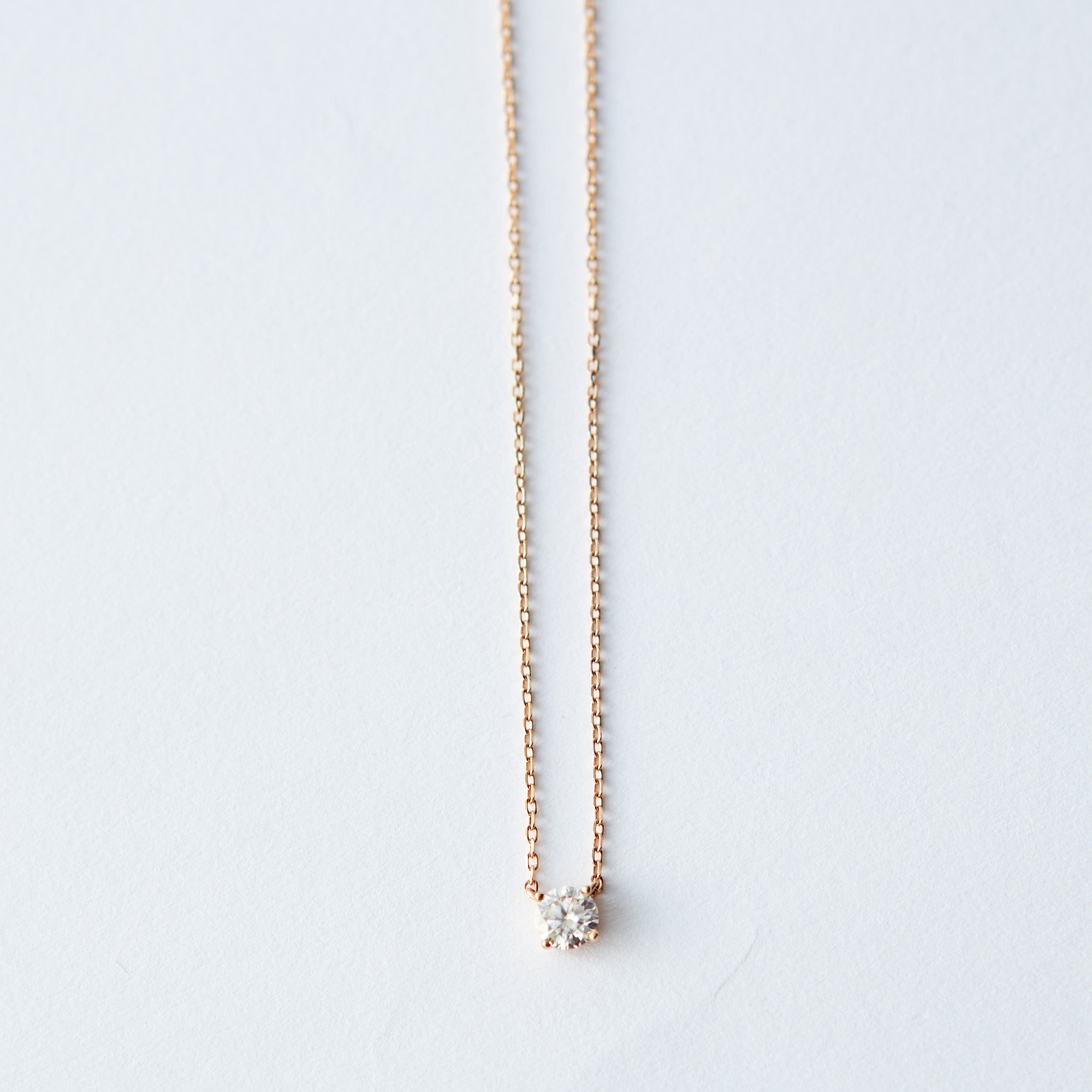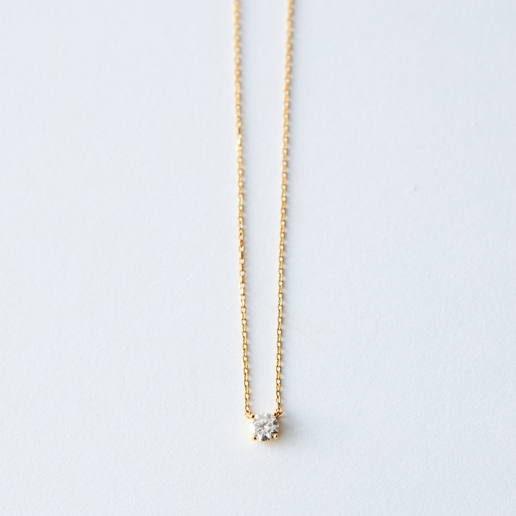 0.5カラット相当のラウンド型モアサナイトを使用した一粒ネックレス。 シンプルで上品なデザインと高級感でシーンや年齢を選ばないため、長くお使いいただけるアイテムです。