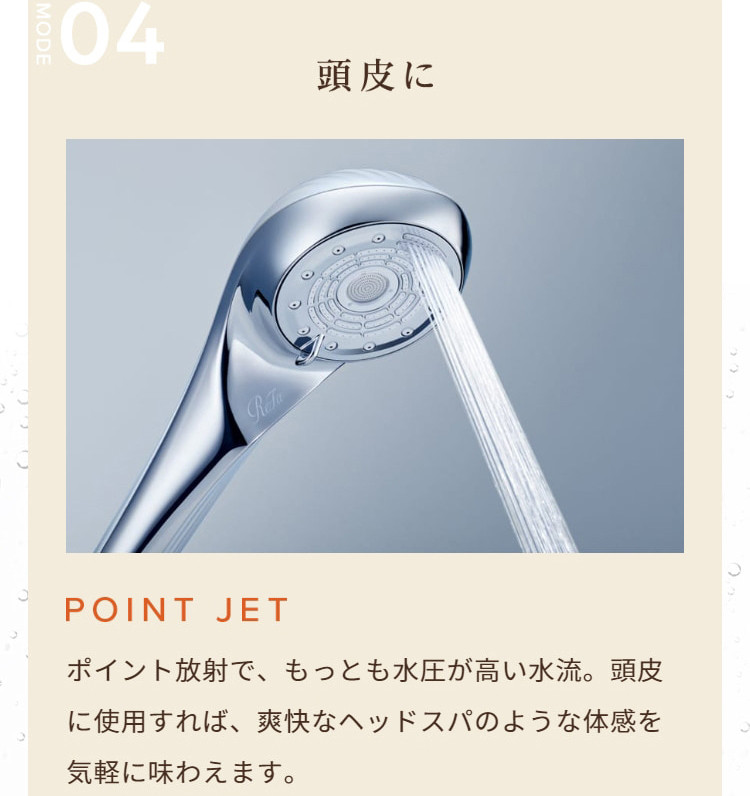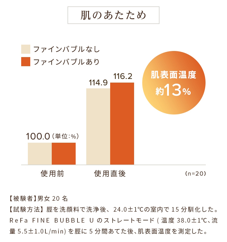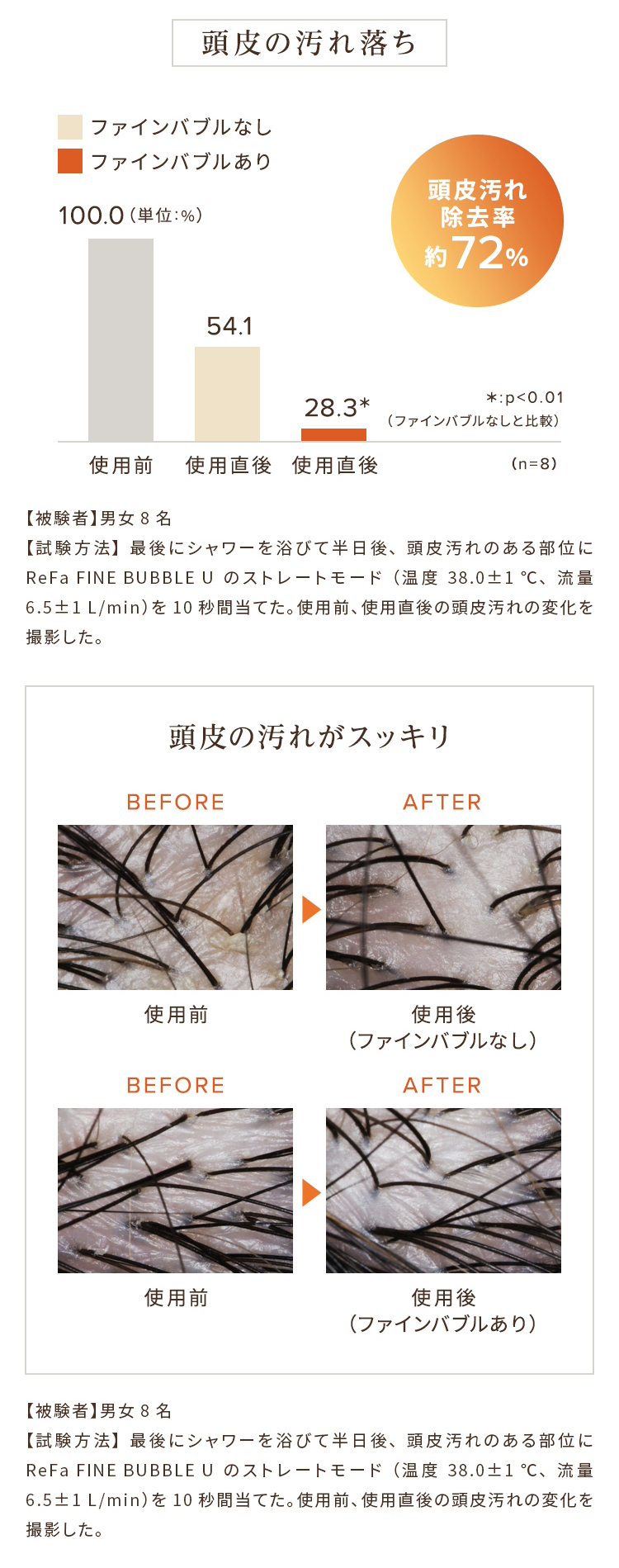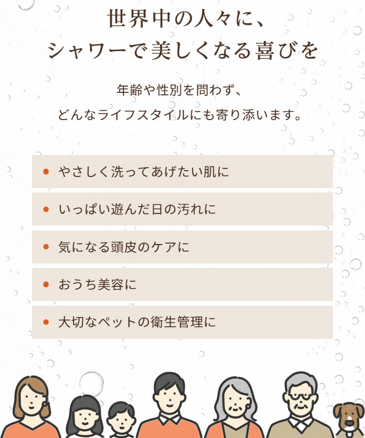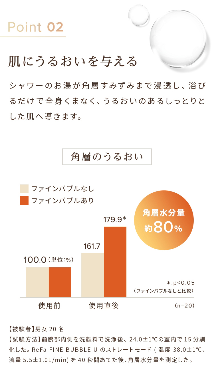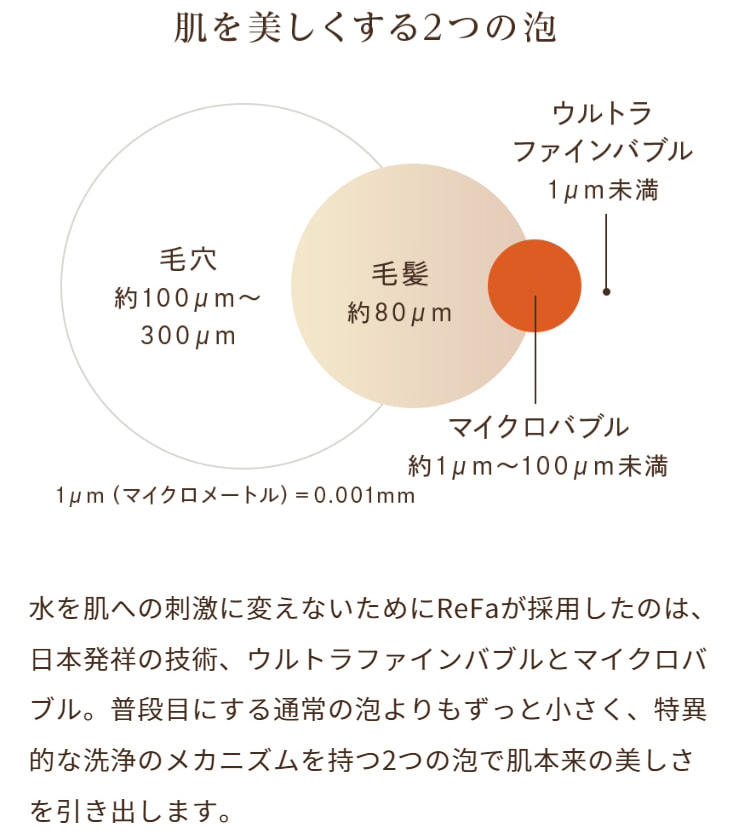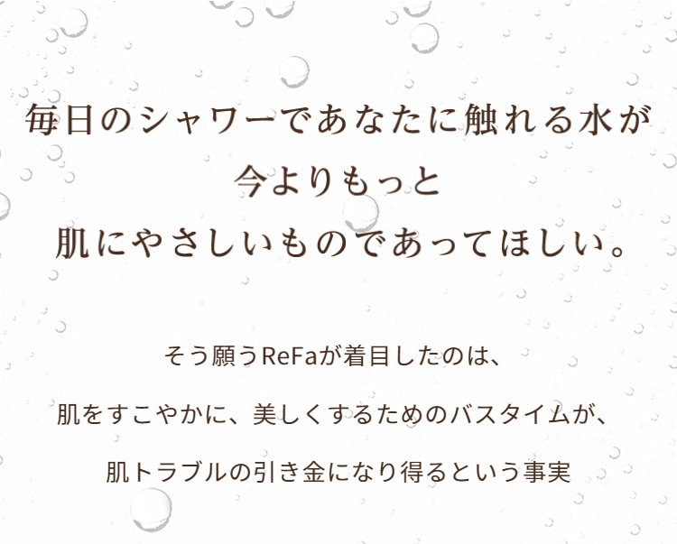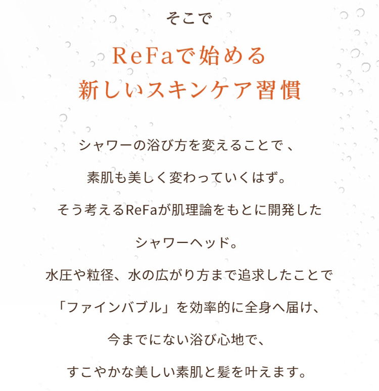 大口注文・法人のお問い合わせはこちら世界中の誰もが、美しくなるためにシャワーを浴びる。 そのとき、やさしく全身を包み込む水はどんなスキンケアよりも一人ひとりの肌に寄り添うものであってほしい。 そう願うReFaがこだわり続けるのは、水と微細な泡だけで素肌を美しくするテクノロジー「ファインバブル」。 独自の水流設計と組み合わせることで、浴びるだけで肌の汚れをやさしく落とし、心地よく温め、みずみずしいうるおいを届けます。 いつものシャワーヘッドを替えるだけで素肌はもっと美しくなる。 ReFaでのシャワータイムがスキンケアの新しいスタンダードへ。