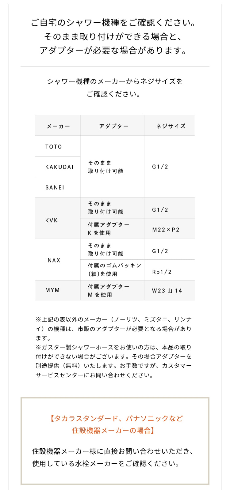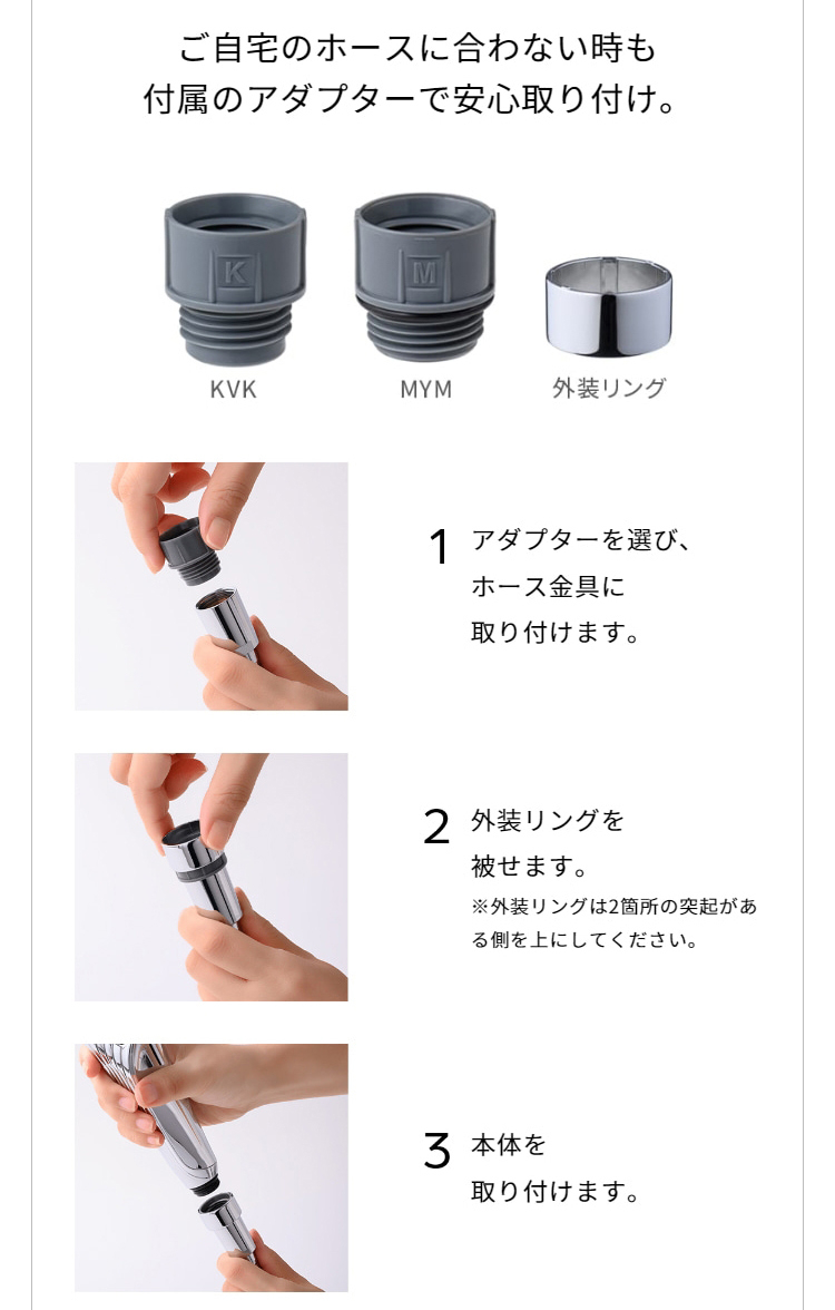 | 付属品 | K(KVK用)アダプター、M(MYM用)アダプター、外装リング、ゴムパッキン(細)、オープナー、取扱説明書(本書)、クイックガイド、ギャランティーカード、保証書 |